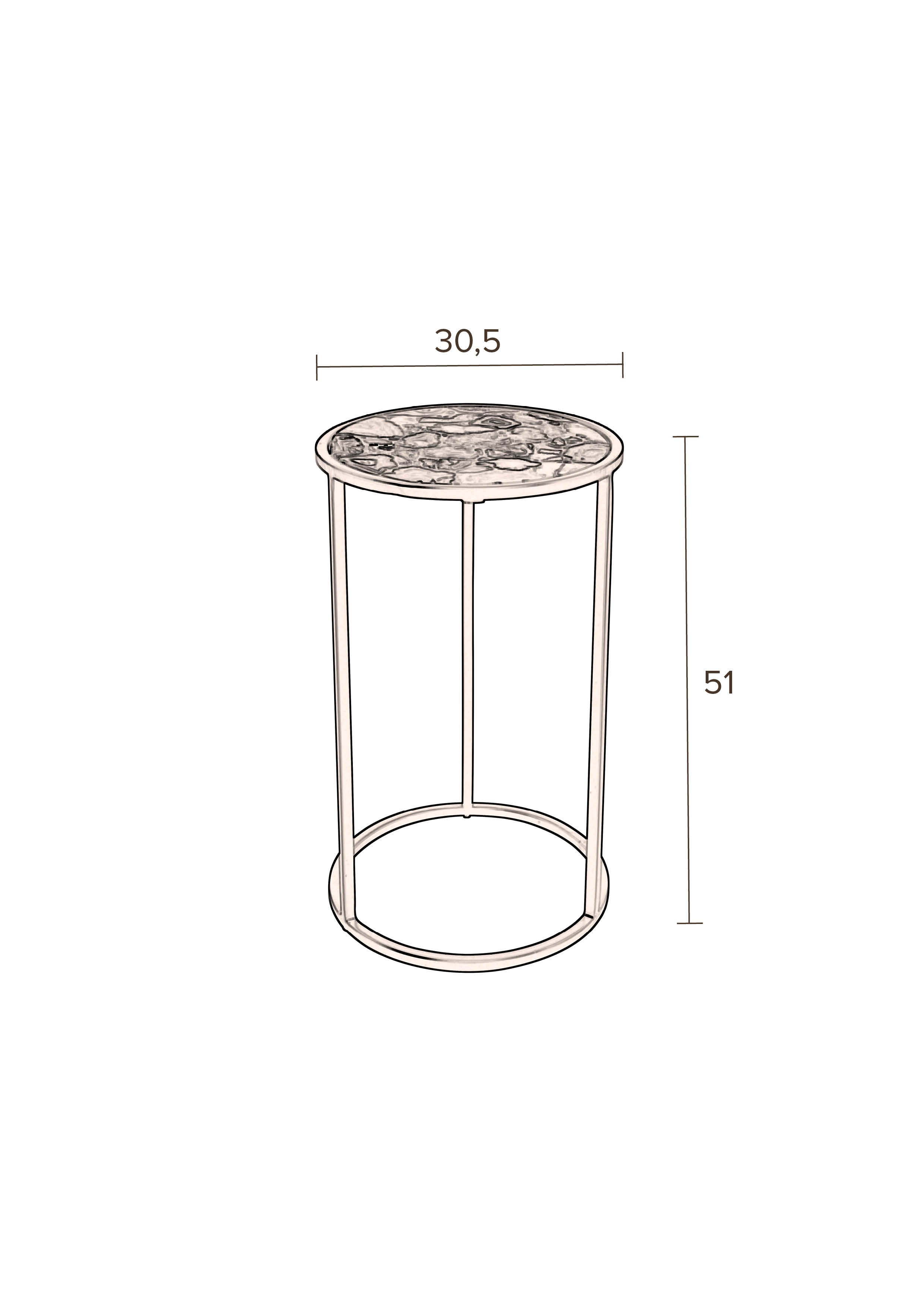 Carga de peso Máximo: 10 kg Dimensiones: 30,5x51 cm (ØxH) Nota: Agata es un producto natural, por lo tanto cada parte superior de mesa es única en aspecto y peso