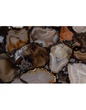 Parte superior con piedras de Agatas y vidrio templado, acabada con una resina epoxy. Marco de cubo del hierro pintado con polvo negro.