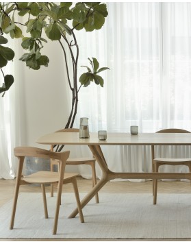La mesa de comedor de roble macizo Mikado, diseñada por Alain van Havre, es uno de nuestros diseños más reconocidos desde hace años. Su carácter escultural es el resultado de la búsqueda del equilibrio entre funcionalidad y estabilidad. Las patas de Mikado se entrelazan como un rompecabezas bien elaborado. Al cambiar el tablero rectangular por una elipse, aumentamos la unión y la conexión. Es más fácil interactuar con los invitados, permite conversar con todo el mundo y tiene capacidad para más de una docena de personas sentadas cómodamente.