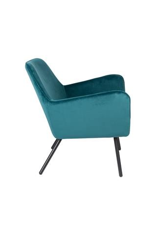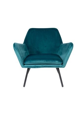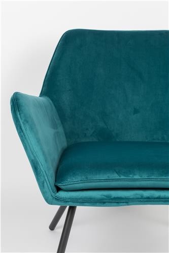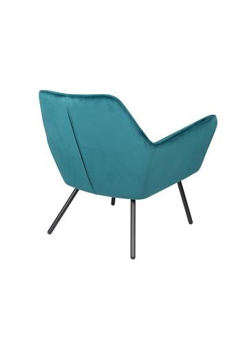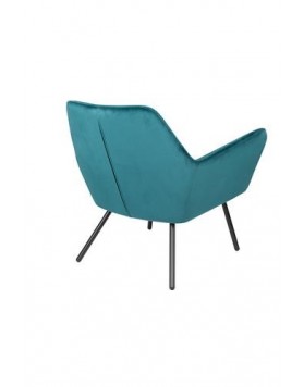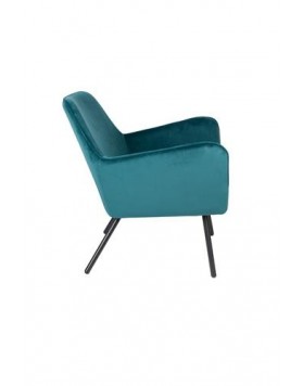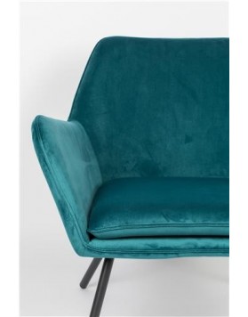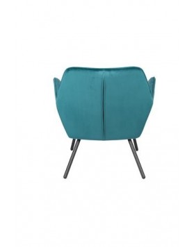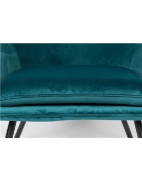 Butaca nórdica con tapizado en cuero PU vintage (para acabados marrón y gris oscuro) o tejido de poliéster aterciopelado (para acabados dorado, azul y verde), carcasa de madera contrachapada y asiento de espuma. Estructura de hierro pintado de negro.