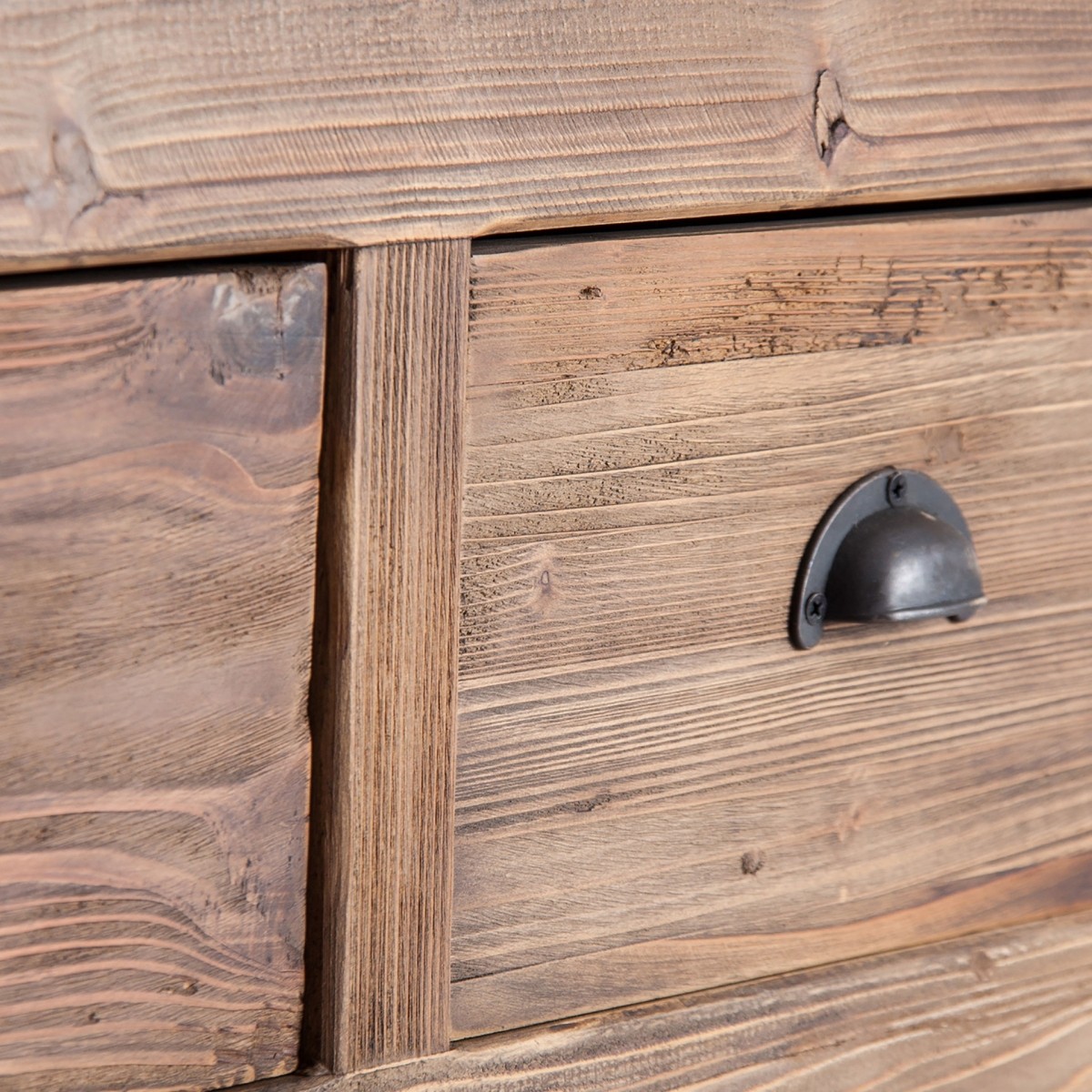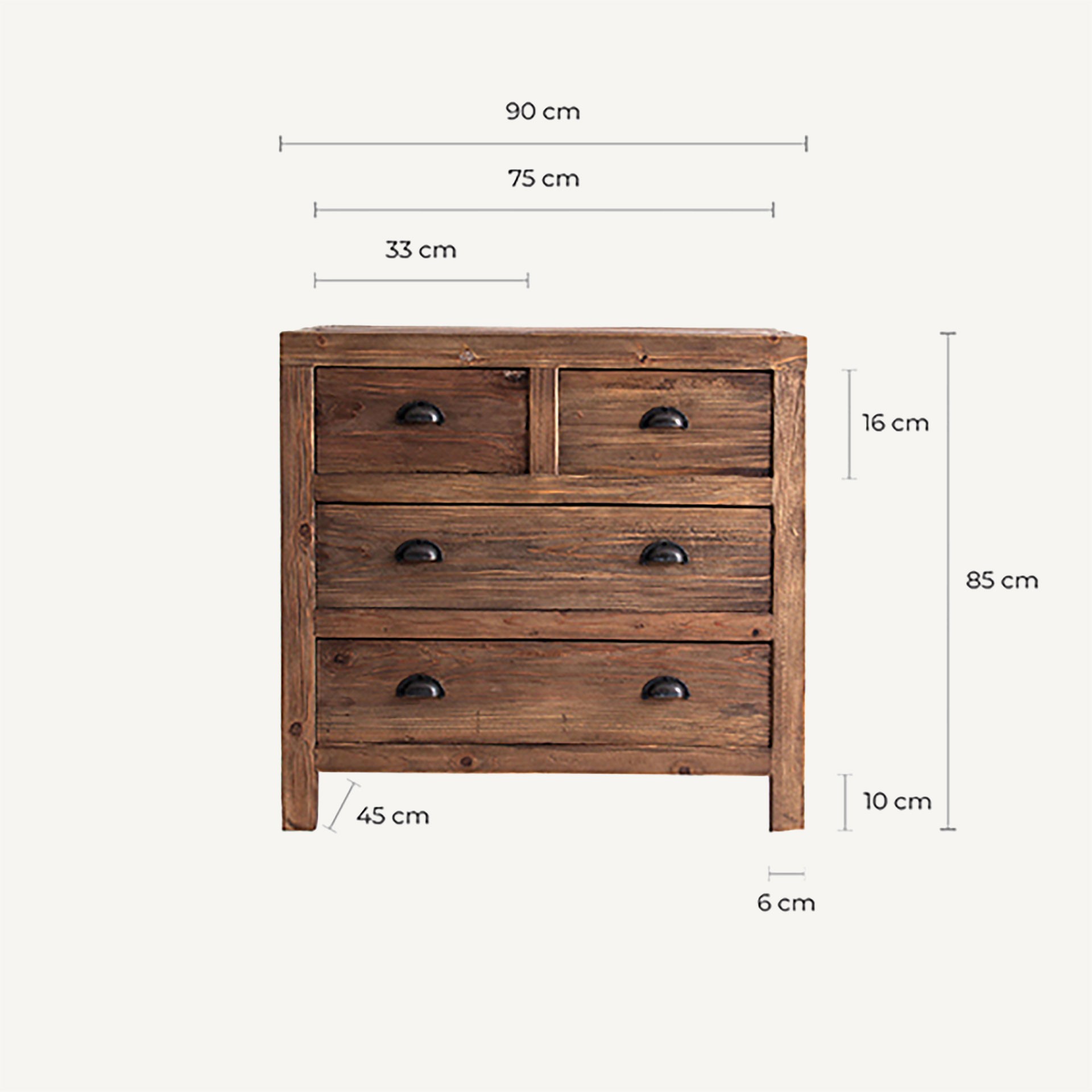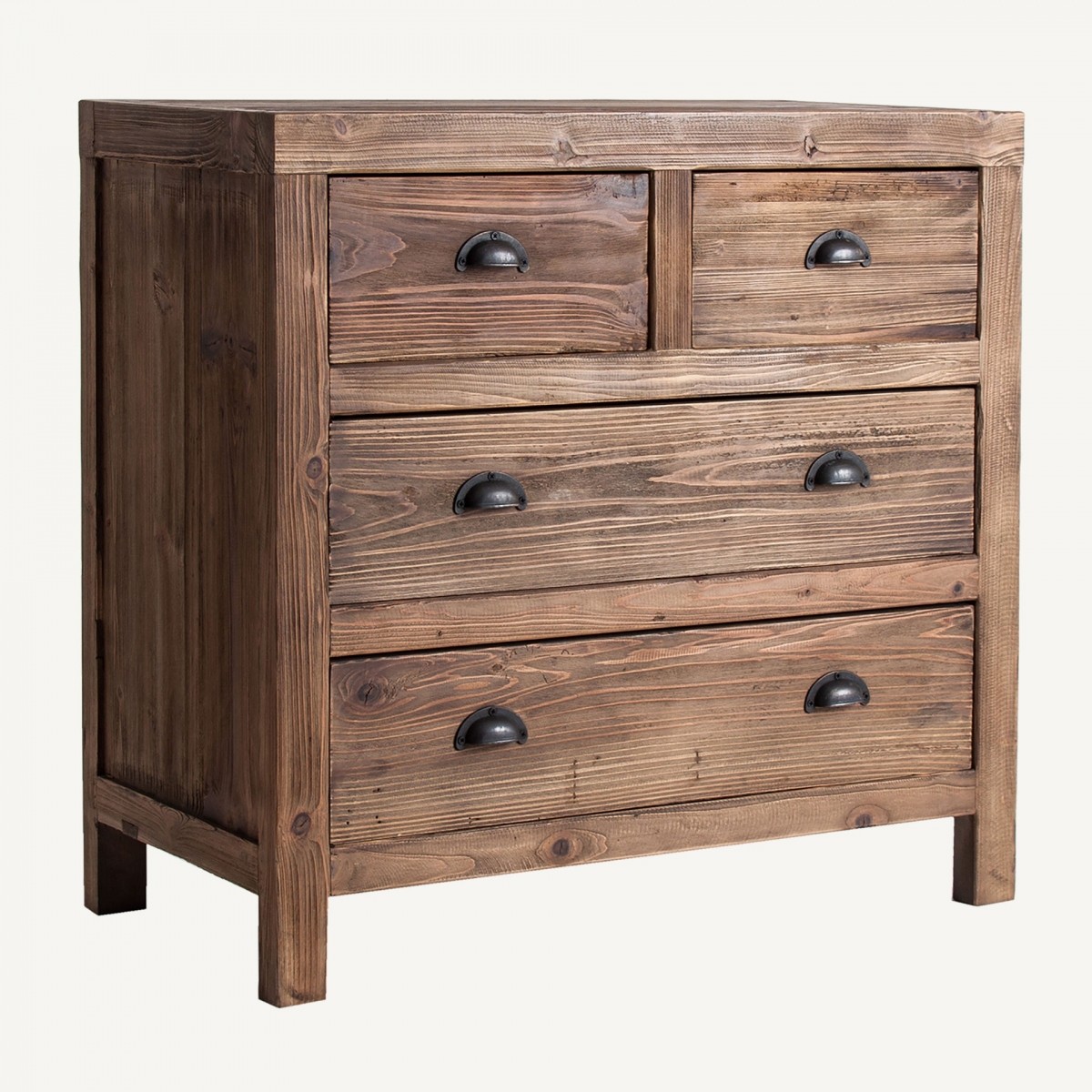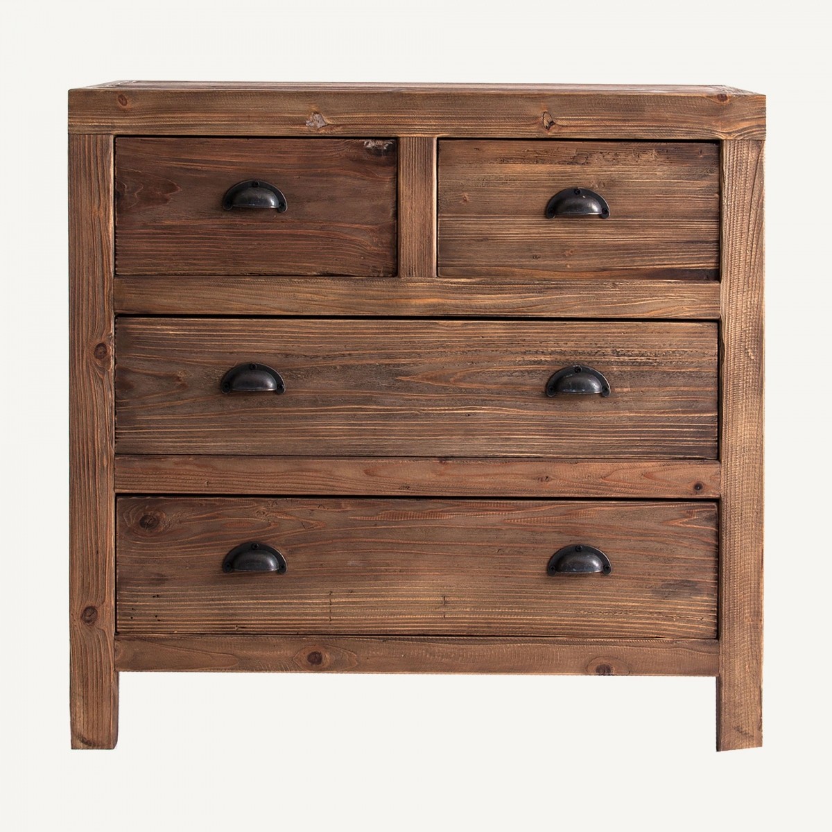 La cómoda Yavit está fabricada en madera de pino reciclada, en color natural envejecido. Esta pieza sostenible viene combinada con tiradores en hierro.