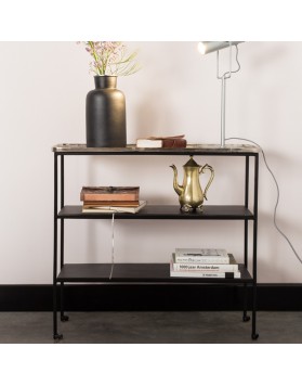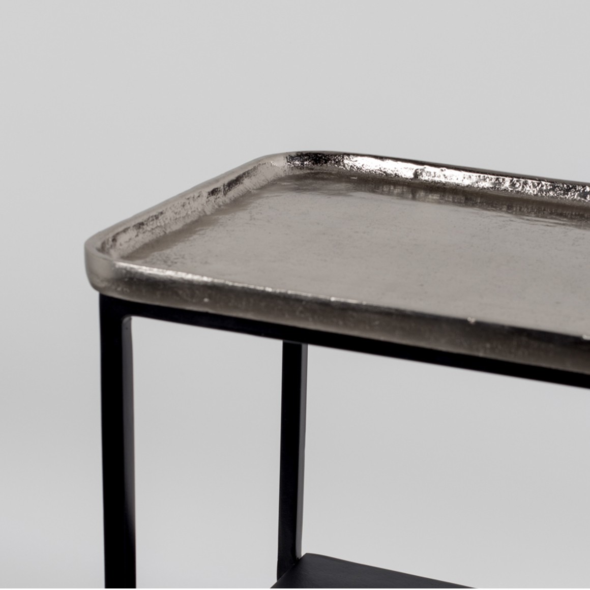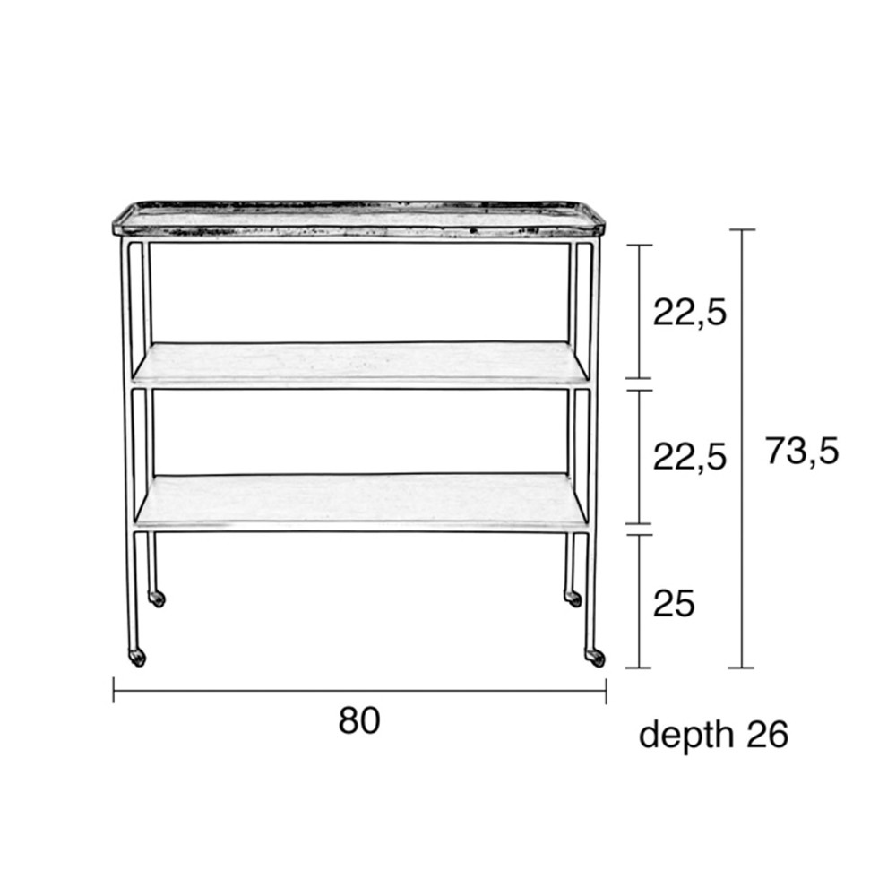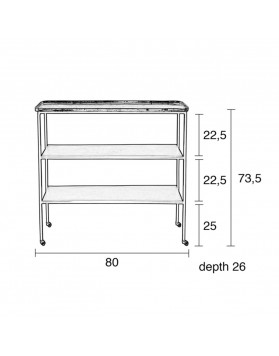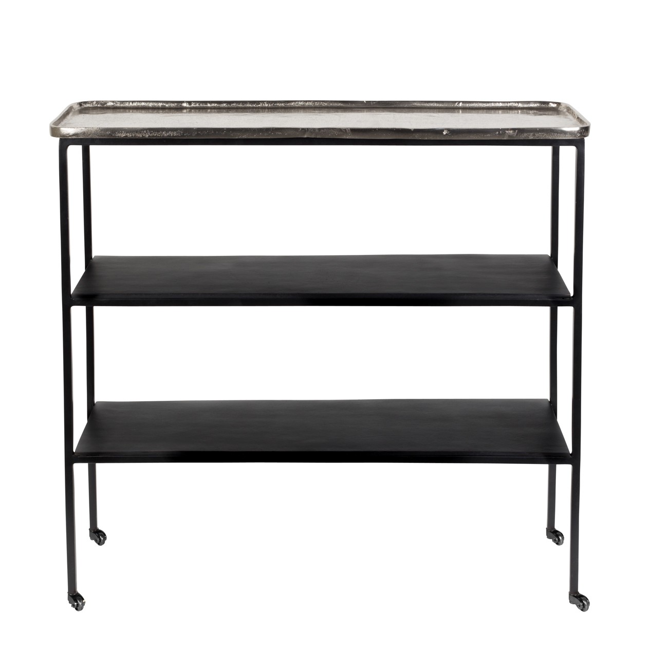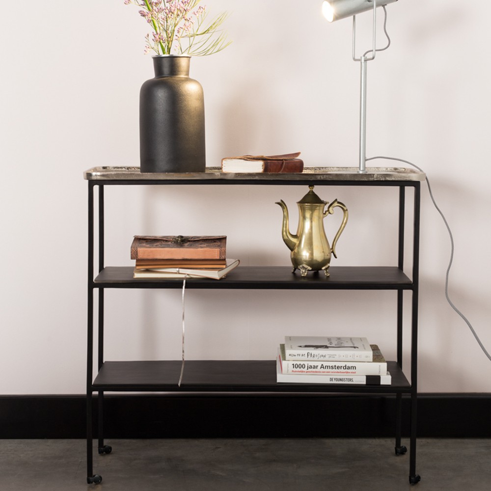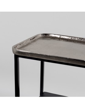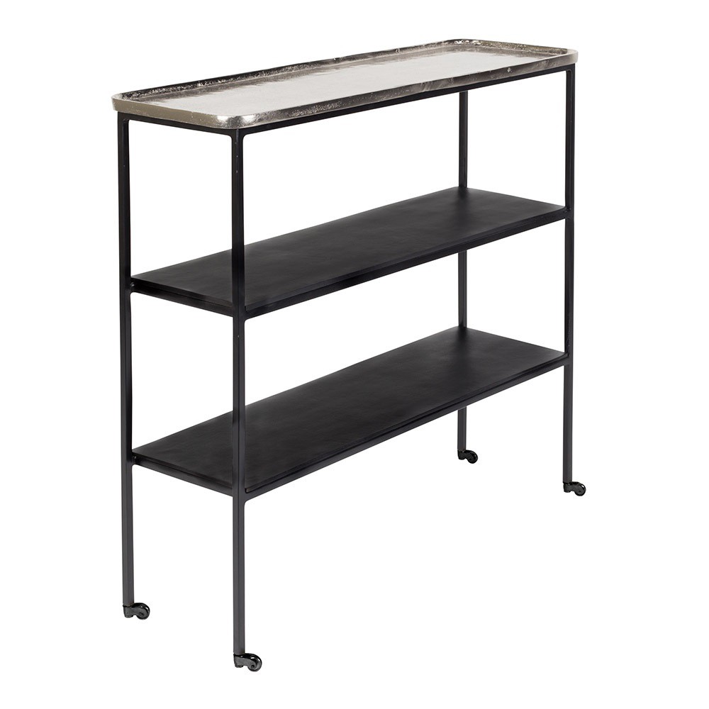 Gusto se puede usar de la forma que desee para usar una mesa de consola. Tiene una mesa con un aspecto antiguo de níquel y el marco de metal negro se apoya en pequeñas ruedas decorativas.