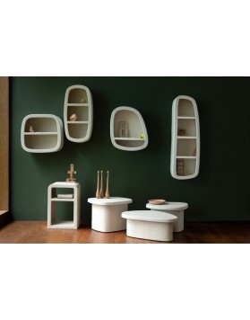 La combinación de formas orgánicas y divertidas con el cálido aspecto del mármol reciclado del que están hechos. El suave color beige también les confiere un aspecto cálido. Esto transforma instantáneamente la habitación en un lugar acogedor donde sentirse como en casa y calentar el alma.