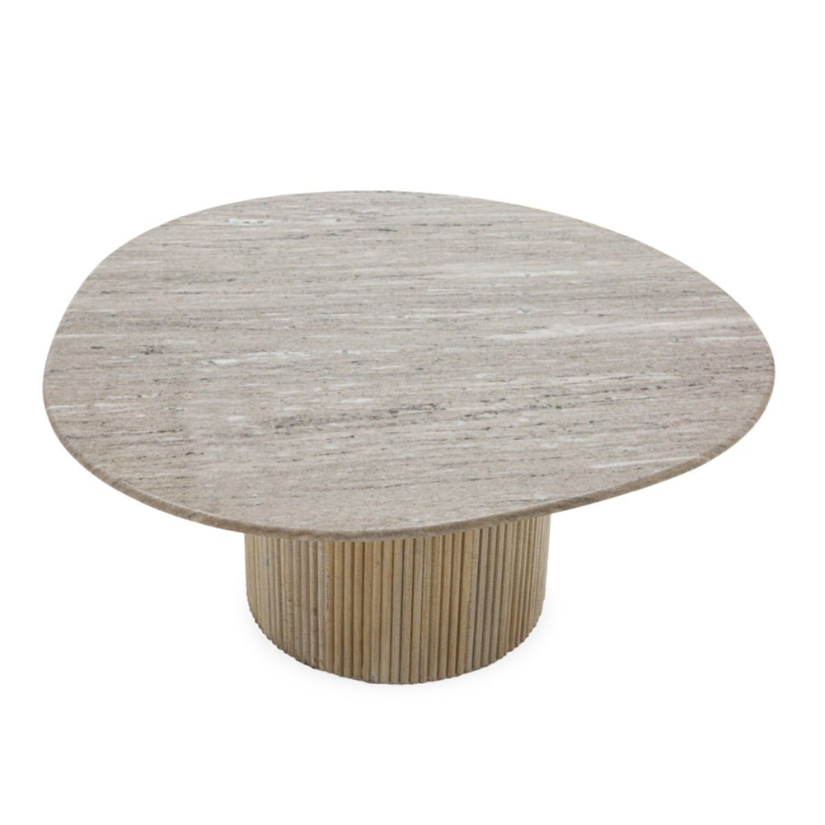 Descubre la armonía entre la naturaleza y el diseño contemporáneo con Arula, una mesa de centro que cautiva por su forma orgánica y su presencia sofisticada. Su sobre en mármol natural gris aporta frescura y elegancia, mientras que la base de madera de mango con acabado blanco lavado aporta textura, calidez y autenticidad.