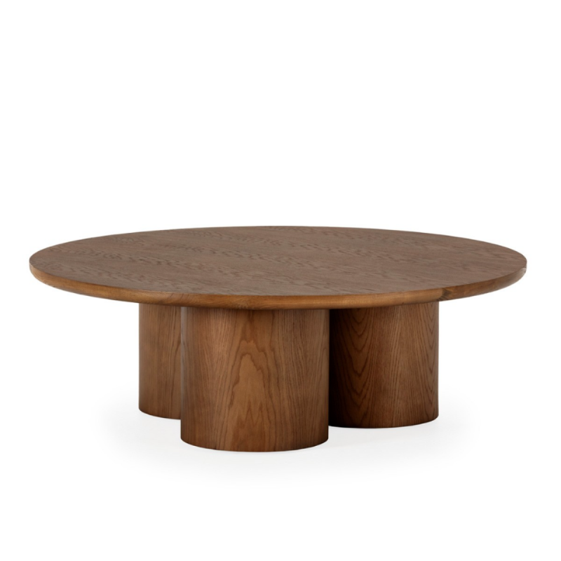 Elegancia y robustez en dos estilos: acabado cálido nogal y acabado moderno negro. Diseño redondo con tres pies centrales y bordes redondeados para un toque natural y seguro.