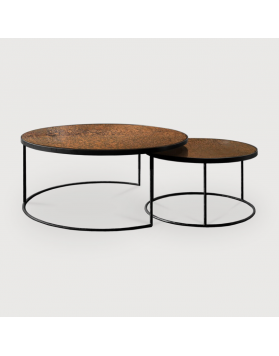 combina elegancia vintage y diseño contemporáneo. Su tablero de espejo envejecido aporta carácter y sofisticación, mientras que su estructura de metal negro añade un toque moderno y minimalista. Se vende en juego de 2 mesas, perfectas para crear composiciones versátiles y funcionales en tu salón.