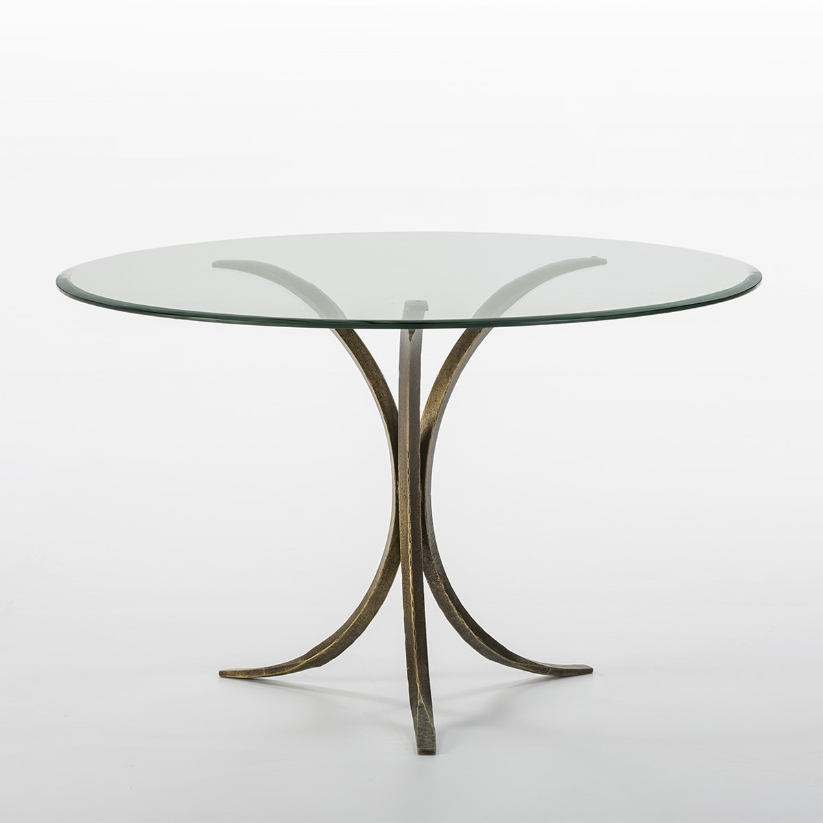 Mesa de comedor con encimera de cristal y estructura en hierro forjado con acabado en pintura dorada.