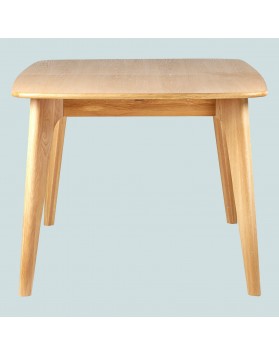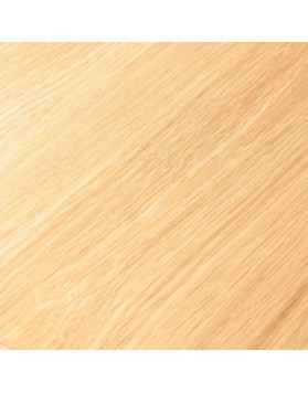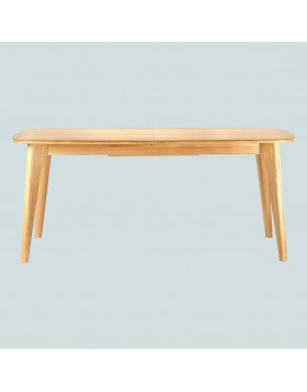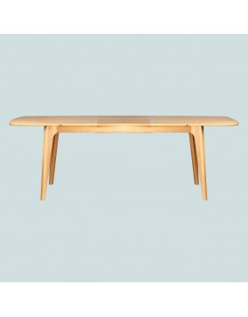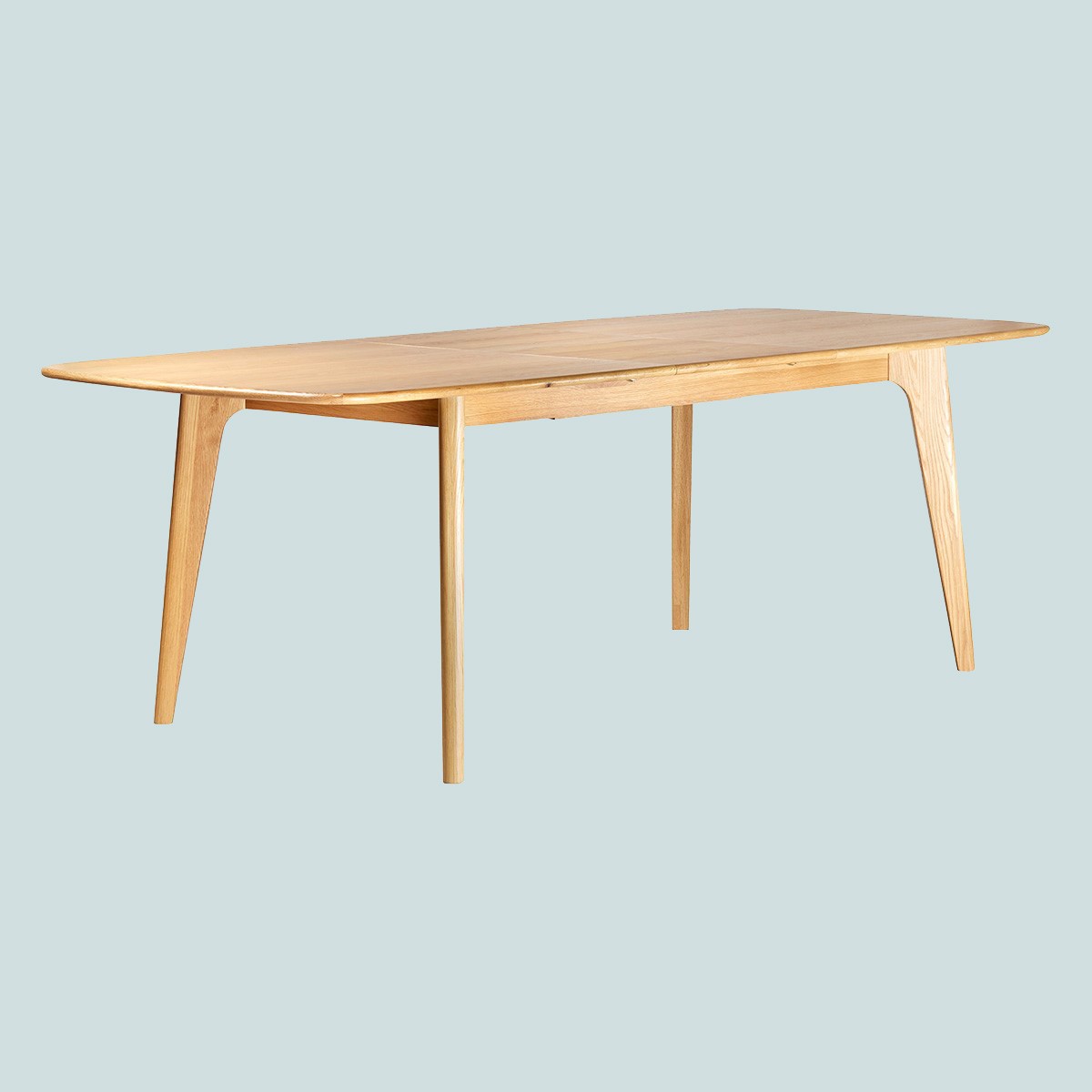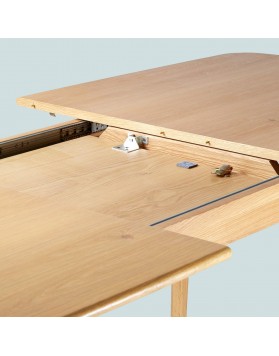 Mesa de comedor extensible con corte central con estructura de madera de roble maciza y sobre de chapa de madera de roble. El sobre con voladizo y sus formas redondeadas aportan ligereza y dinamismo a esta mesa espectacular.