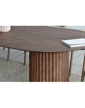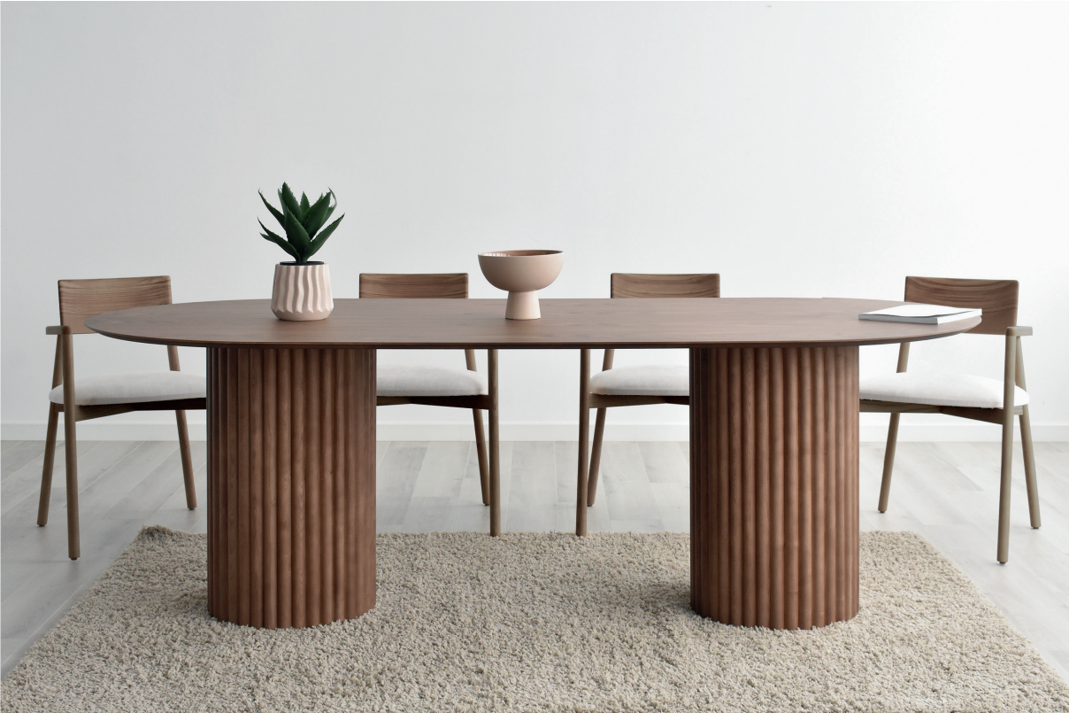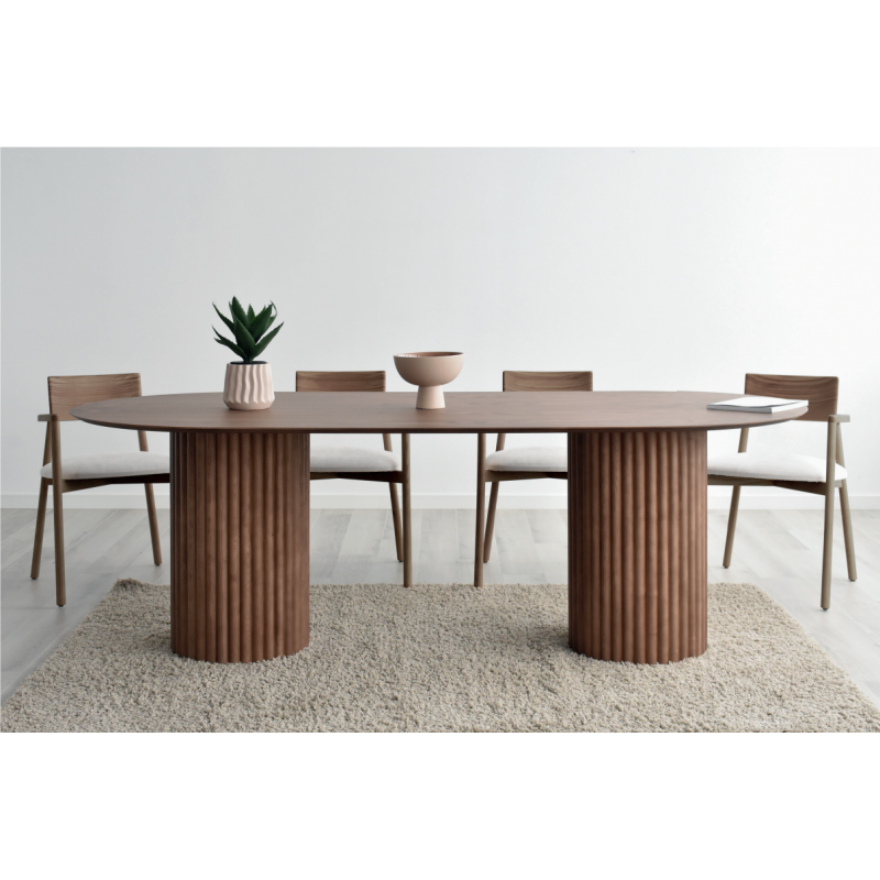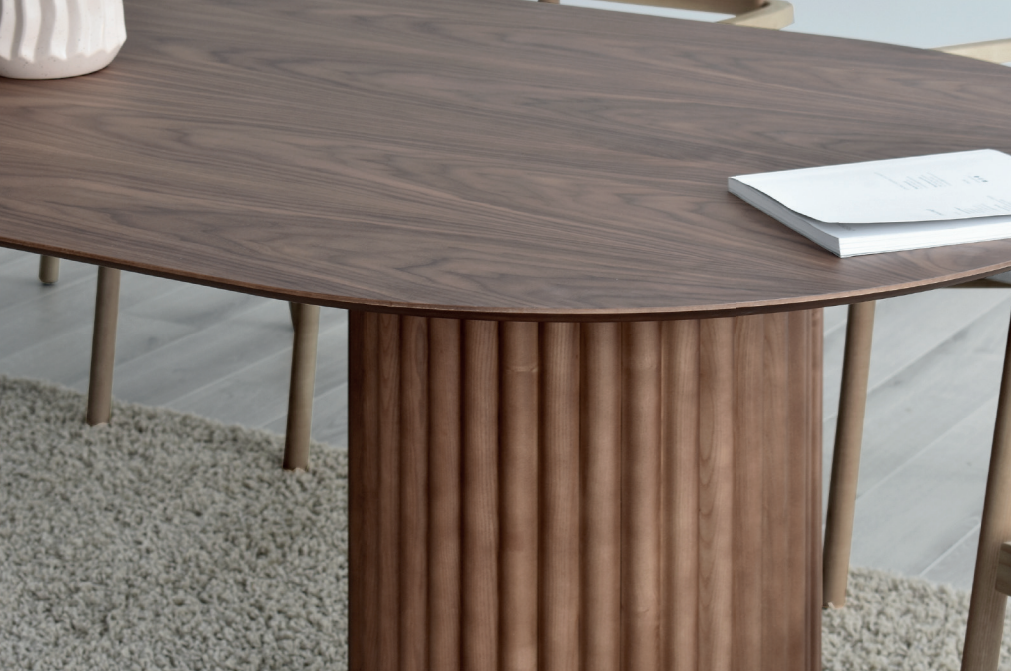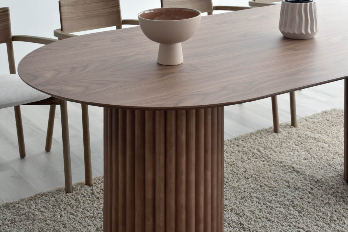 Esta mesa tiene un diseño nórdico con influencias niponas, en el que los materiales y las formas orgánicas cobran protagonismo. El pie-base, con listones de madera maciza, crea un espacio ligero y cálido que aporta al hogar originalidad y carácter.