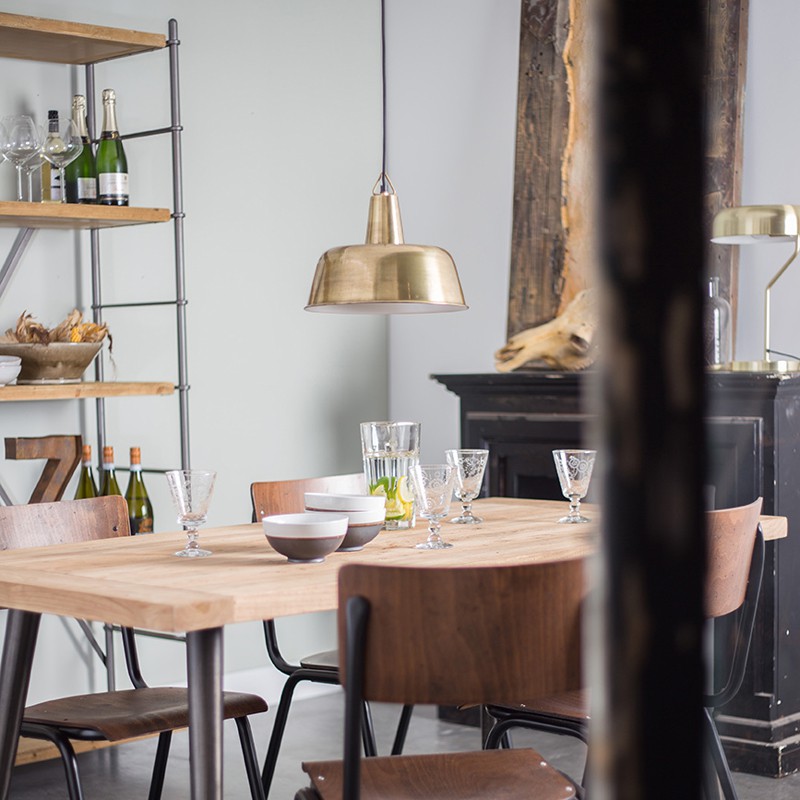 Lámpara colgar estilo vintage de metal acabado bronce por fuera y blanco nacarado por dentro.