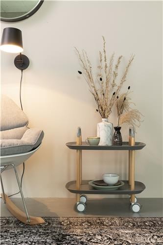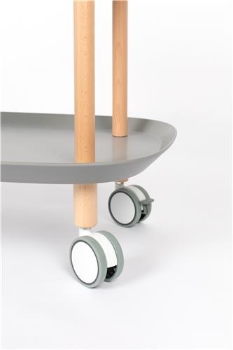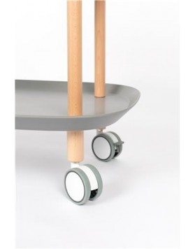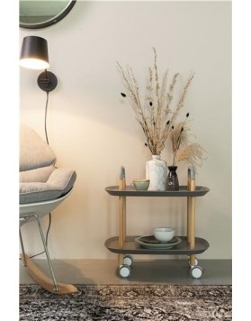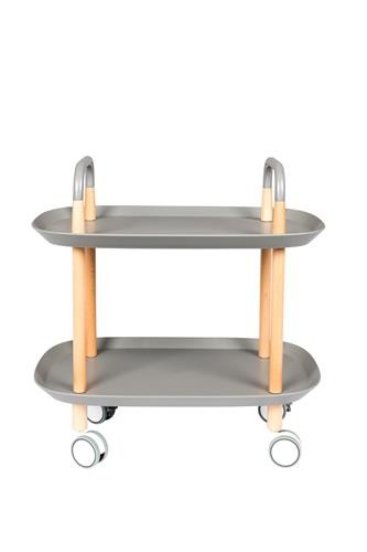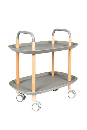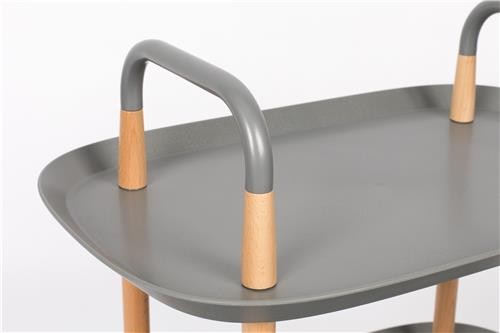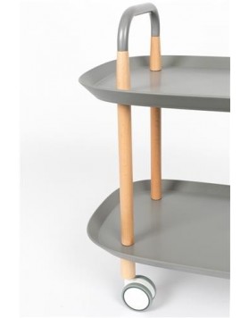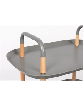 Camarera pequeña con 2 asas de hierro con recubrimiento de polvo, 2 estantes de polipropileno y estructura de madera maciza de haya con acabado barnizado.
