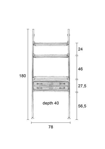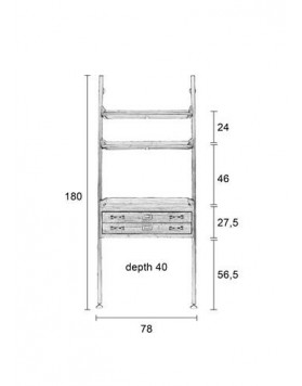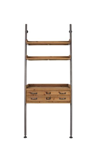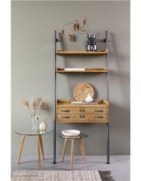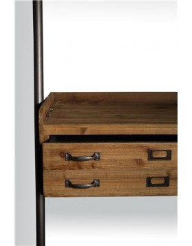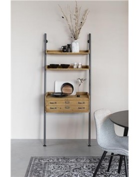 Estantería de apoyo en pared con 3 baldas y 1 cajón. Los estantes y cajones están hechos de madera maciza de abeto natural con estructura de hierro pintado en polvo.