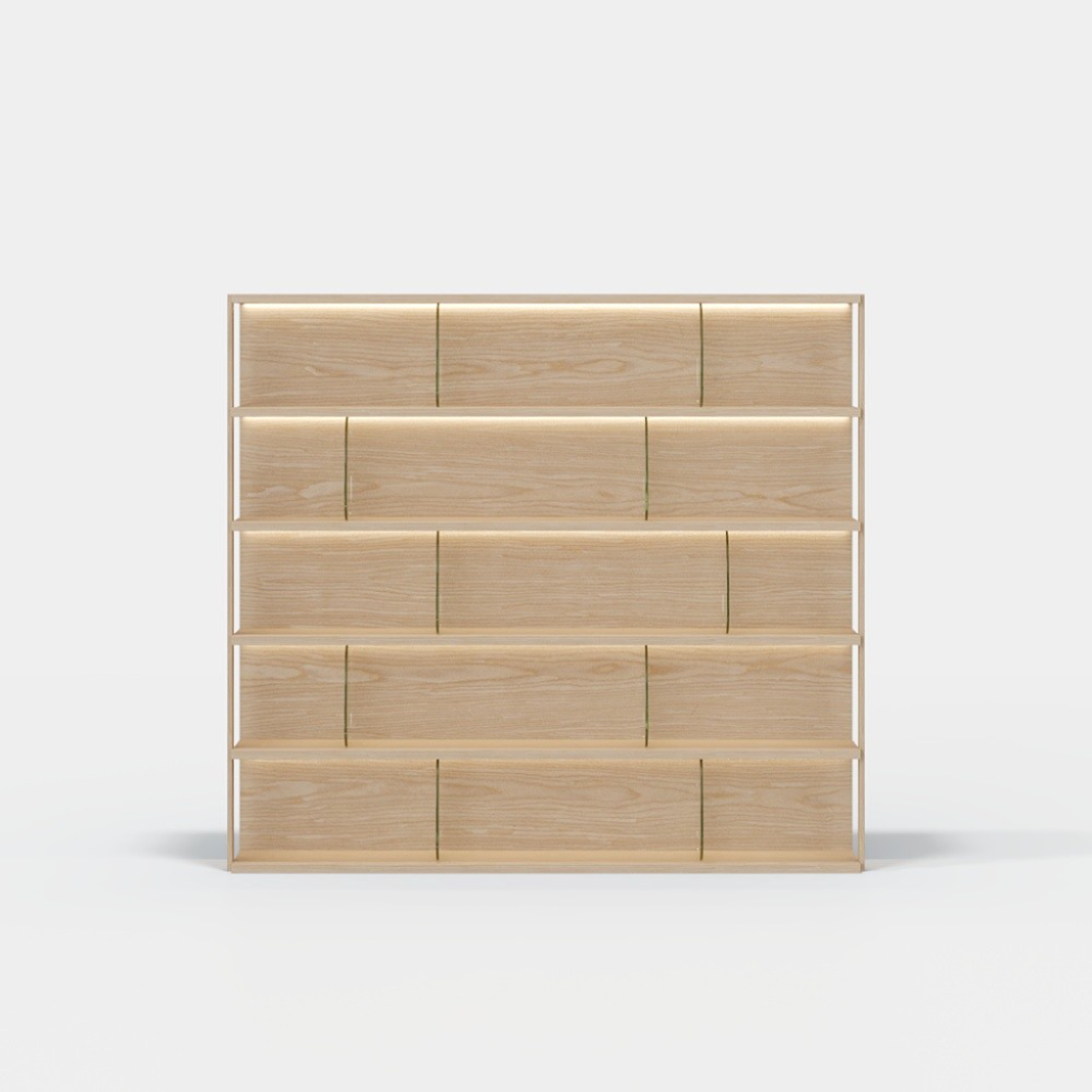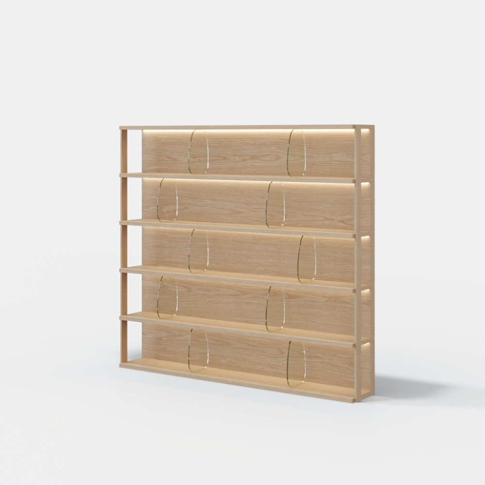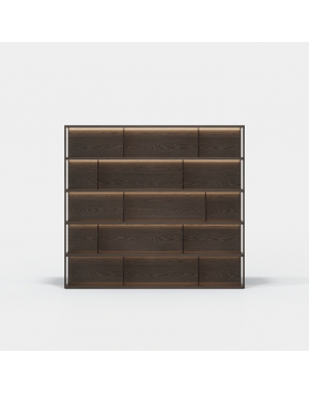Estantería elegante en chapa de madera laminada, con acabados personalizables (Nogal, Roble, Eucalipto o Fresno en mate) y detalles en cristal. Disponible con lacado mate o brillo e iluminación LED opcional. Sofisticación y funcionalidad en una sola pieza.
