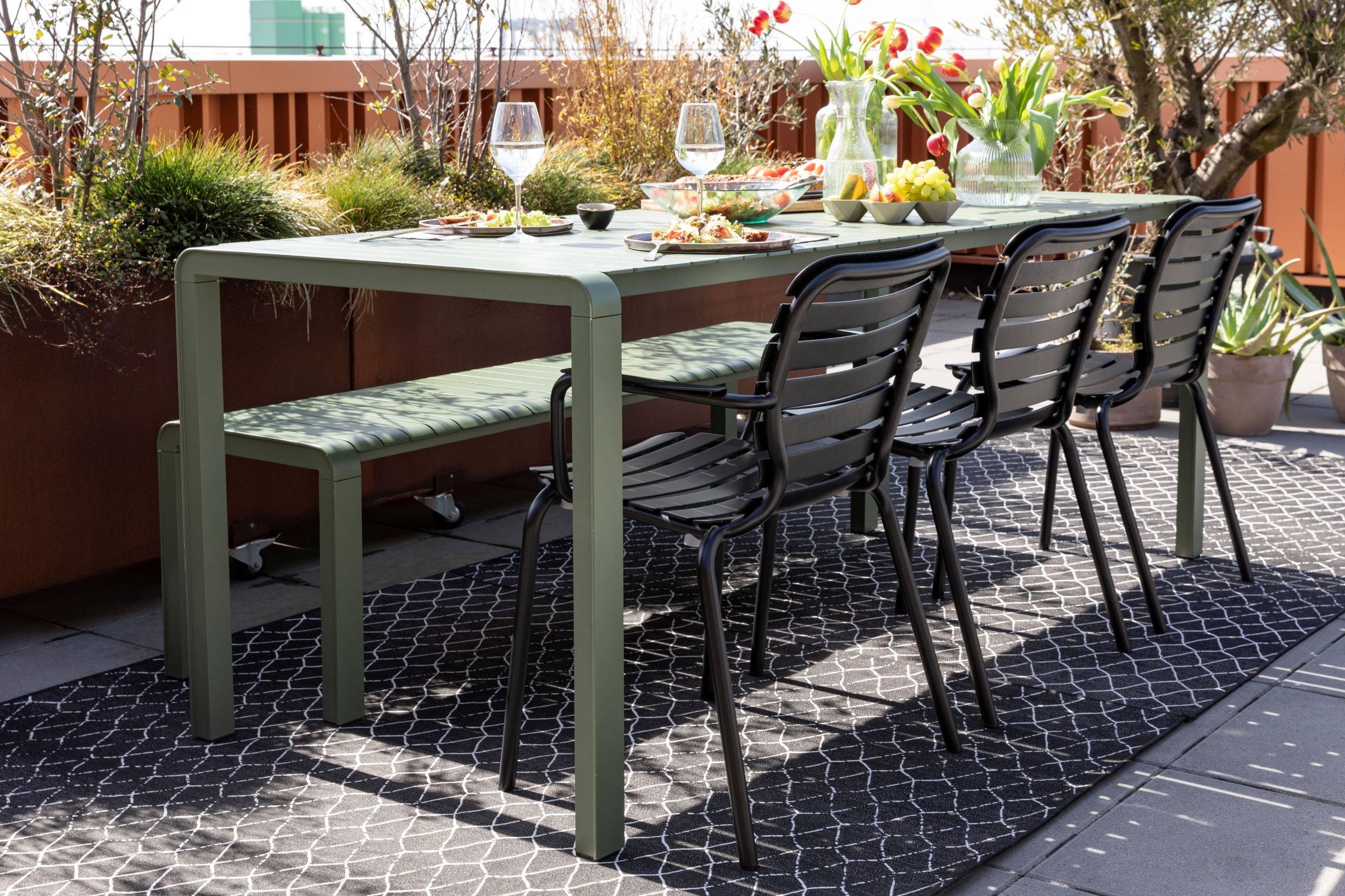 Asiento y respaldo de aluminio pintado en polvo. Apto para exteriores. Peso máximo de carga: 140 kg