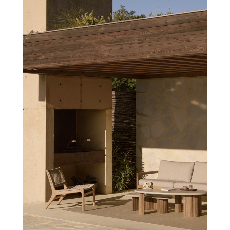 La mesa de centro Boomerang combina materiales resistentes y estética contemporánea para adaptarse tanto a interiores como a exteriores. Su tablero está elaborado en cemento con acabado artesanal y sellado, lo que proporciona una superficie duradera y preparada para el uso cotidiano. La base está fabricada en teca maciza recuperada, aportando estabilidad y un carácter natural que contrasta con la superficie mineral.