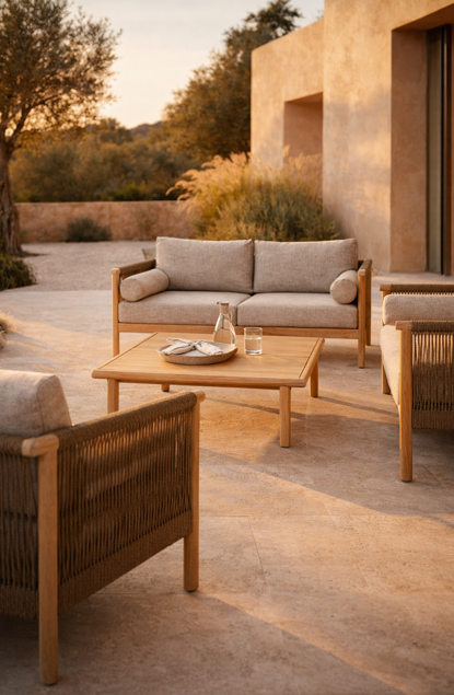 Set sofá y mesa para adaptarse a tu espacio. El mobiliario Oasis transforma cualquier exterior en un espacio acogedor y elegante.