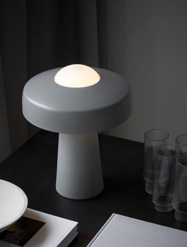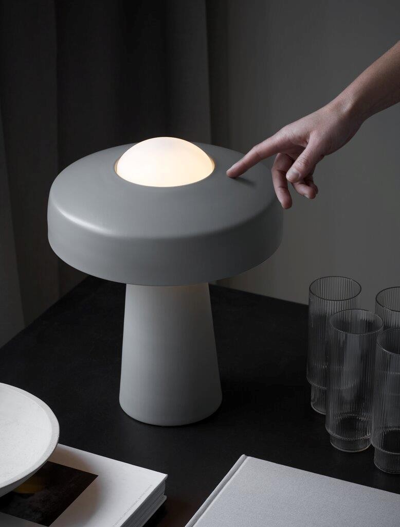 Time se inspira en las esponjas del bosque, y junto a la combinación de metal mate y cristal se consigue una expresión sencilla y elegante. Se crea una luz hacia arriba y hacia abajo con el pequeño elemento de vidrio en la parte superior de la pantalla, lo que contribuye a crear un ambiente acogedor. El tiempo tiene una función de encendido/apagado incorporada