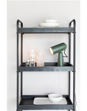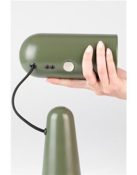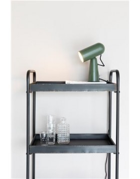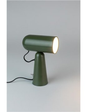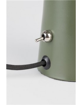 Lámpara de mesa con pantalla y base de hierro con recubrimiento de polvo con interruptor de palanca cromado. Cable texturizado negro para los acabados verde y gris oscuro, blanco para la lámpara con acabado blanco.