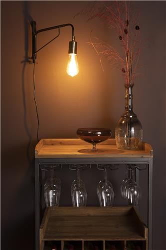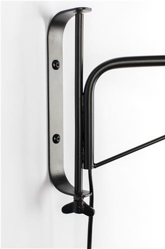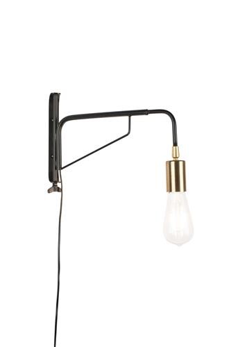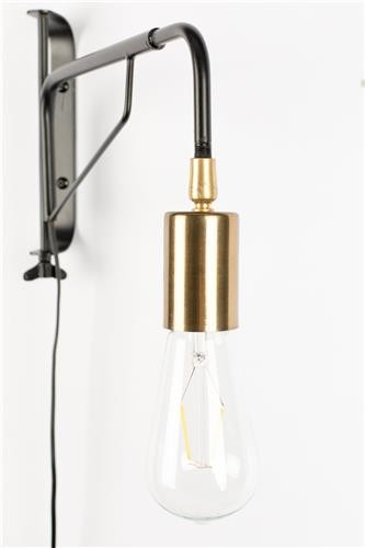 Aplique de pared con pantalla de hierro con recubrimiento de polvo de latón con cuerpo y base de hierro con recubrimiento de polvo negro.