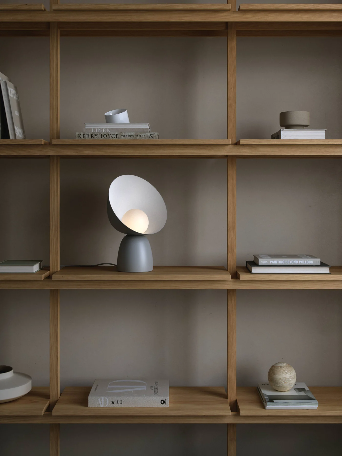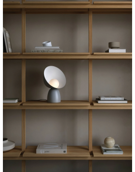 La lámpara de mesa Hello de la diseñadora danesa Charlotte Høncke tiene un lenguaje de diseño alegre y acogedor y una silueta clásica y orgánica. La pantalla grande abraza maravillosamente la cúpula de vidrio blanco opalino e incluso se puede girar completamente para obtener una mezcla divertida entre luz directa e indirecta.