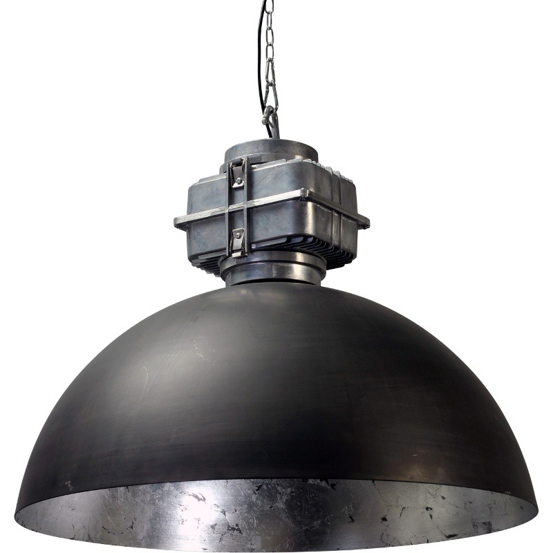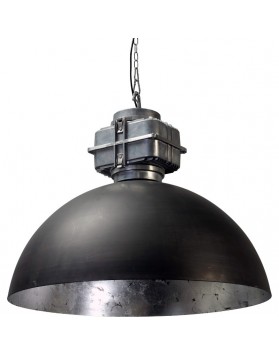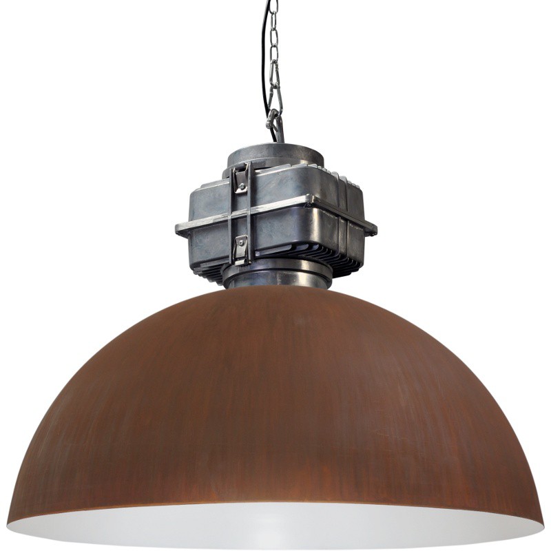 Lámpara de suspensión industrial en acero. Acabados exterior oxidado o color plomizo. Interior en 3 opciones: blanco, pan de oro o pan de plata. Altura del cuerpo 63 cm. Diámetro de la pantalla 80cm. Bombilla E27 max. 75W.
