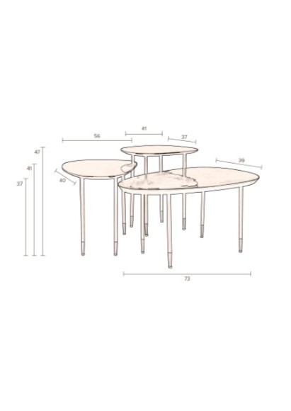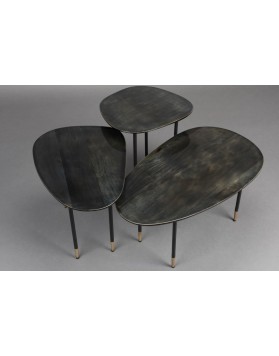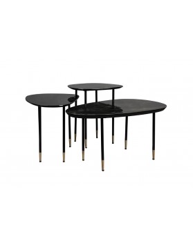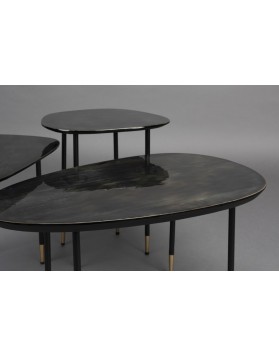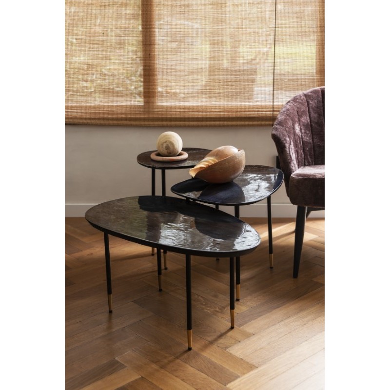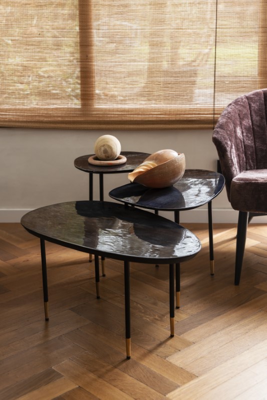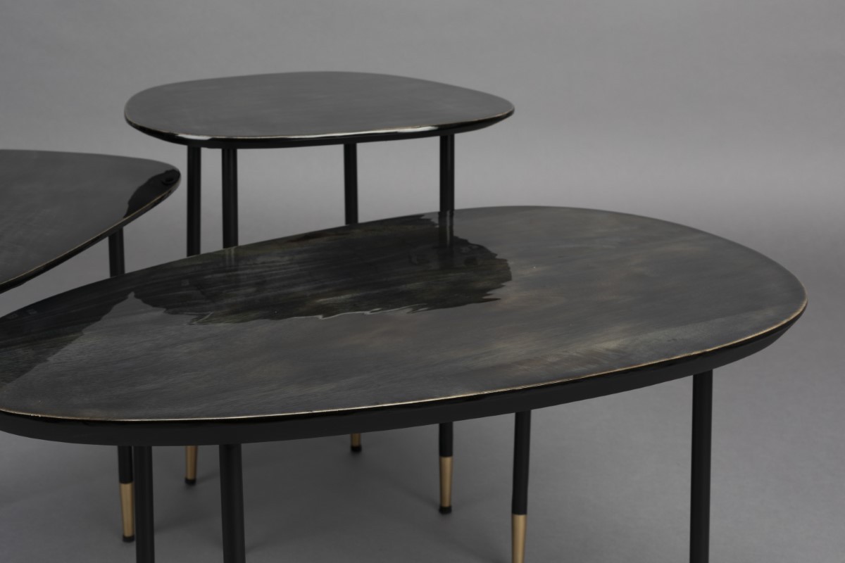 El sofisticado aspecto de este set de mesas la mesa Phyllis te transporta directamente al ambiente de un interior de los años 50 ó 60. Las mesas tienen un tablero de forma orgánica de madera de mango y patas de metal negro, con un detalle dorado en cada extremo. Junto con el acabado brillante del tablero, crea un aspecto sofisticado que eleva instantáneamente el ambiente de cualquier habitación a un nivel superior. Los diferentes tamaños hacen que las mesas sean perfectas como mesas de centro en la zona de estar, pero también son agradables de usar por separado.