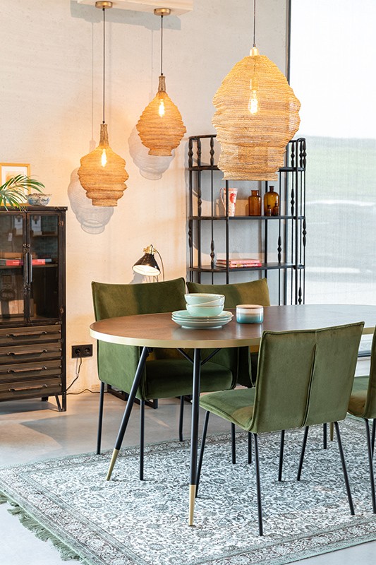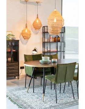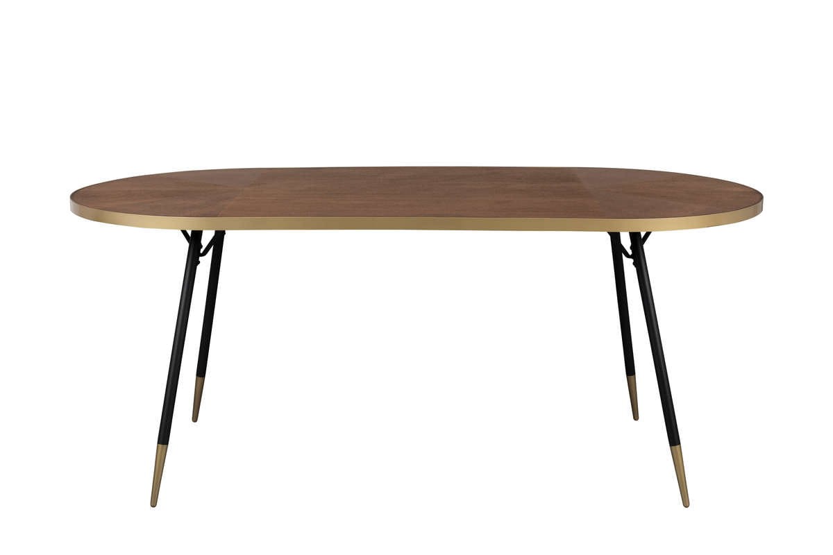 Tablero de MDF de 30 mm con chapa de madera de fresno en acabado color nogal (teñido y lacado), borde de hierro pintado en oro. Patas con recubrimiento de polvo negro. Patas pintadas en oro sobre tapas de plástico.
