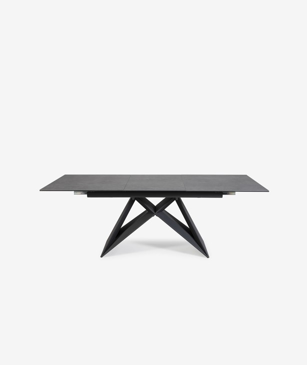 Esta mesa extensible -que combina metal, cerámica y cristal- alcanza los 220cm de longitud cuando está desplegada, frente a los 160cm cuando está cerrada. Su ancho de 90cm hace de esta mesa una pieza de tamaño estándar para el mercado nacional atendiendo a las dimensiones habituales de los espacios y la tendencia de encajar de 4 a 6 comensales con ella cerrada, frente a los 10 que podría albergar con ella extendida