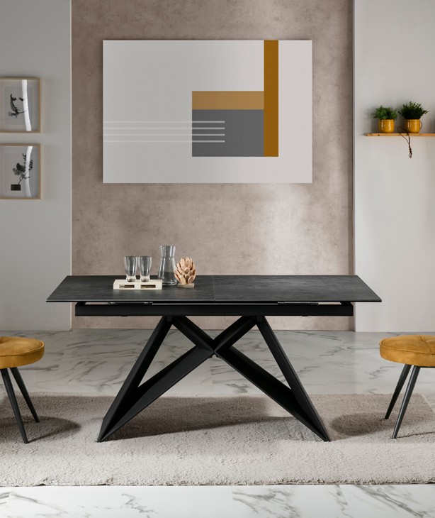 Mesa extensible que combina metal, cerámica y cristal