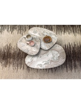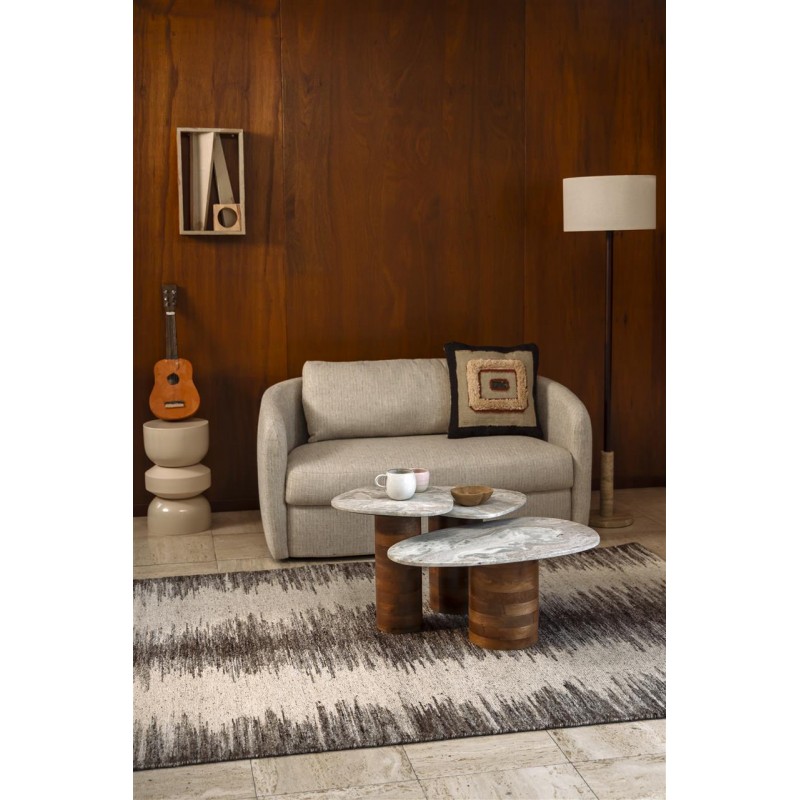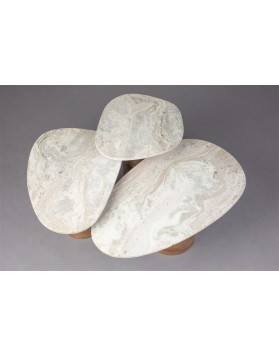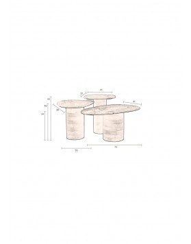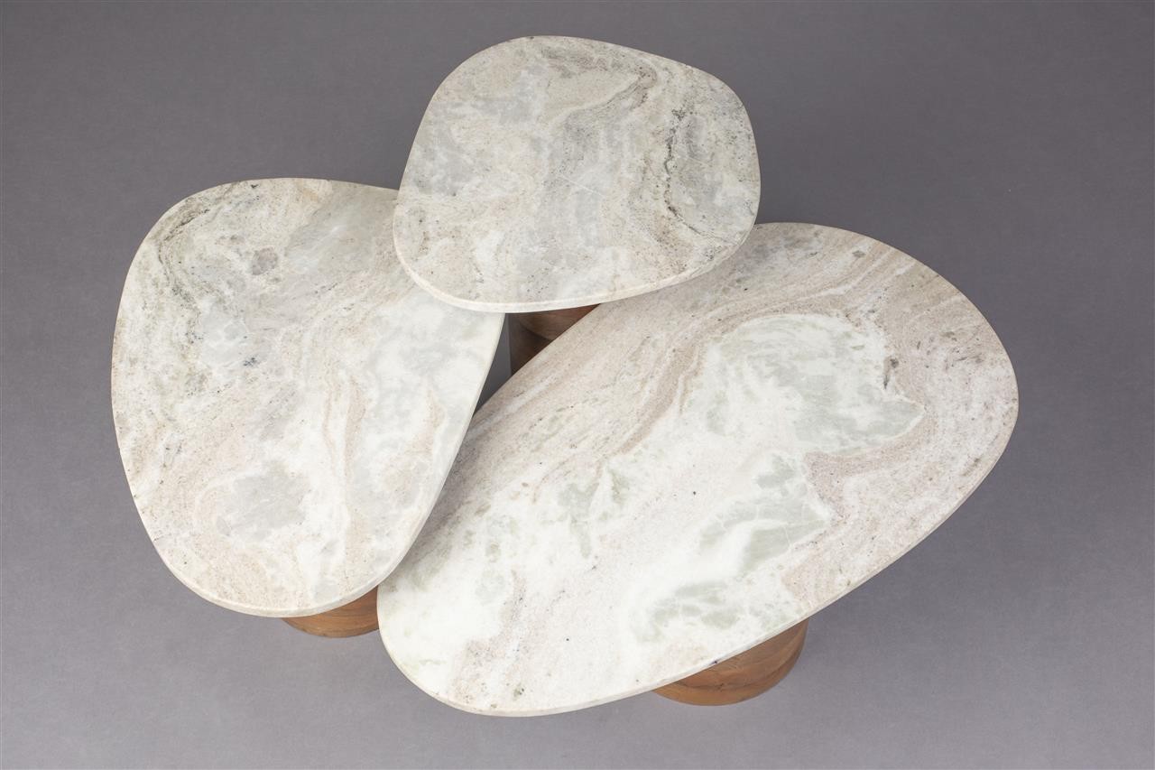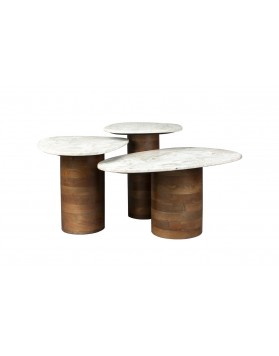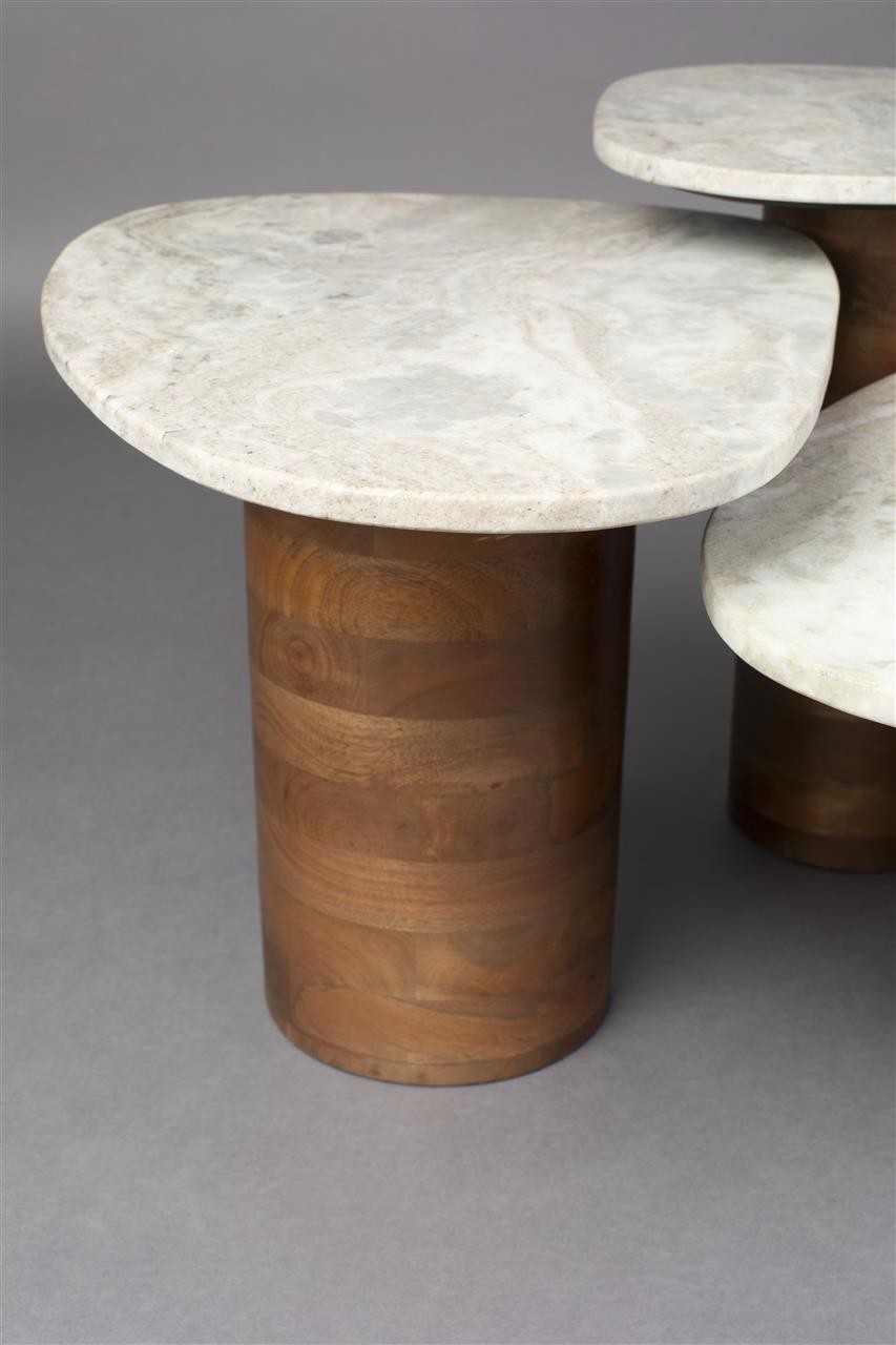 Las mesas auxiliares Suki forman un set de tres piezas que combina elegancia y calidez gracias a su diseño orgánico. Cada mesa presenta una base cilíndrica de madera maciza de mango y una superficie de mármol auténtico, creando un contraste natural y sofisticado.