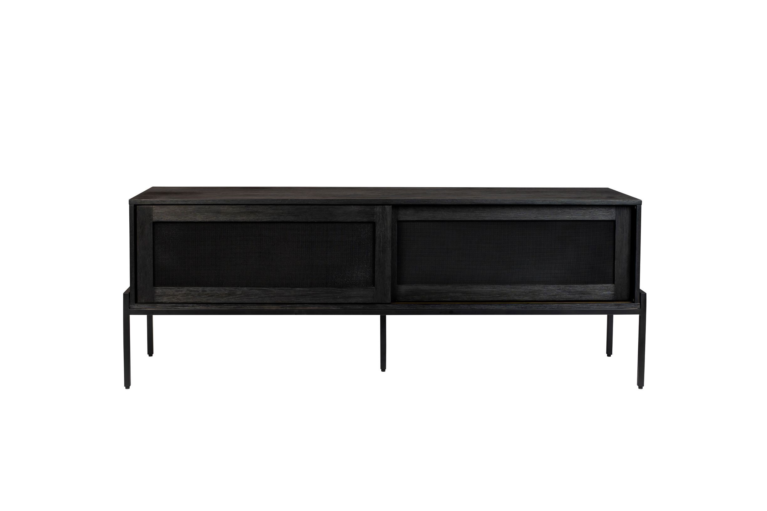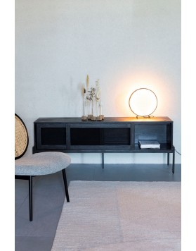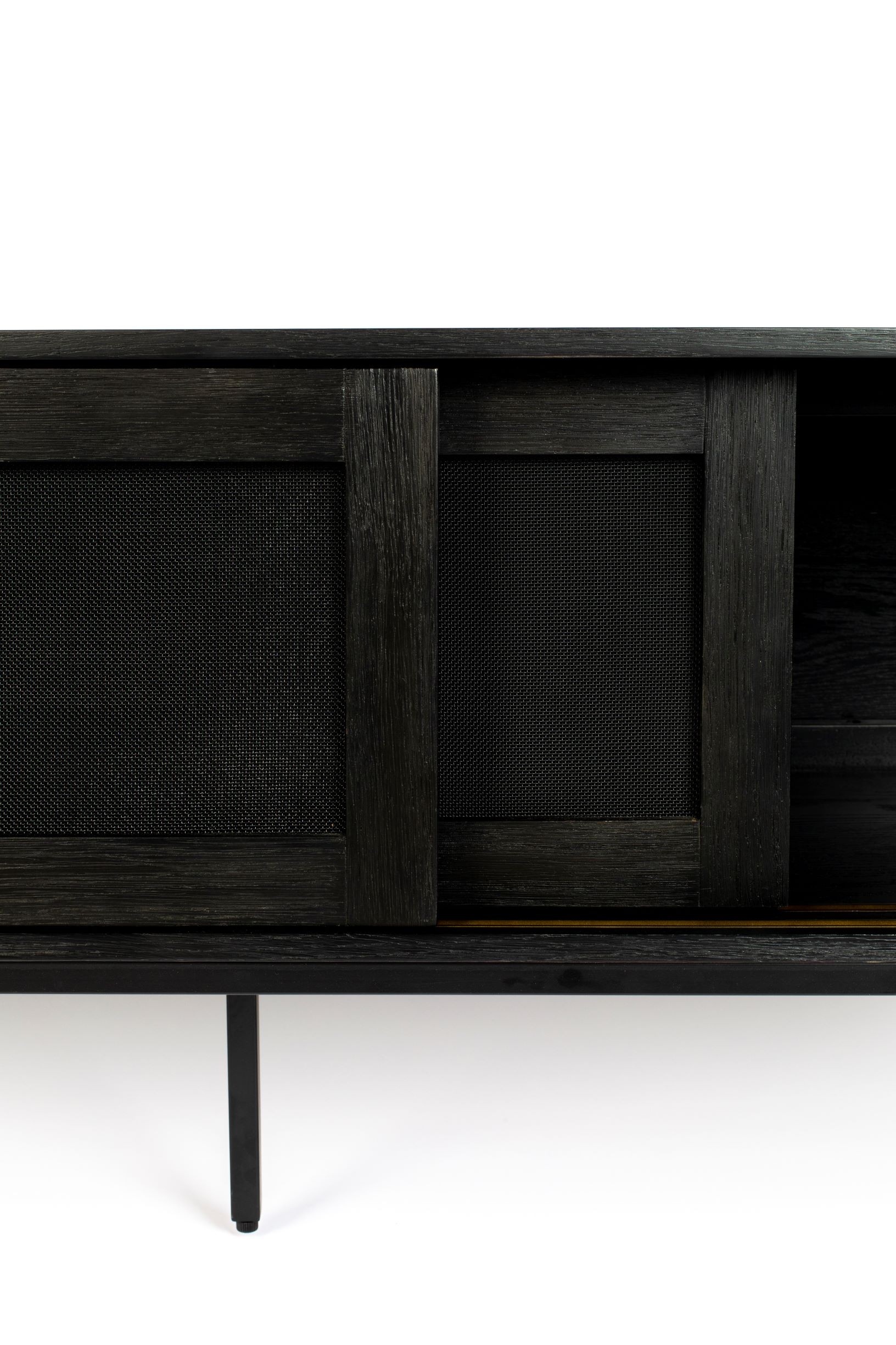 Hardy con su hermoso acabado enchapado en roble oscuro. Aún mejor: las puertas con incrustaciones de malla solo muestran un toque de las siluetas de todo lo que hay dentro.