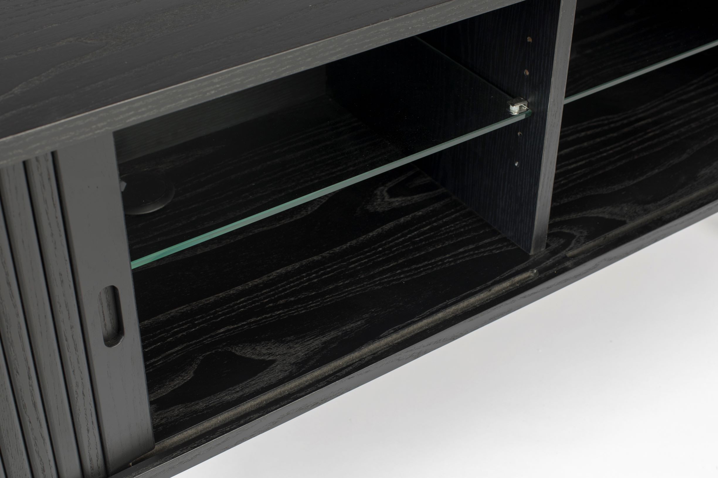 Parte superior e inferior de MDF chapado en fresno de 18 mm. Puertas y patas de persiana de madera maciza de fresno (Ø 45 mm) MDF lacado PU transparente con chapa de fresno en el interior. Dos estantes: vidrio templado de 6 mm, regulable en altura. Apertura de cables y orificio de ventilación en ambos compartimentos. Peso máximo de carga: 10 kg por balda de cristal, 40 kg total aparador.