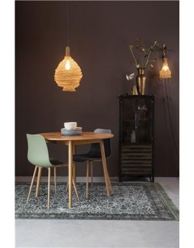 Silla ligera de carcasa de polipropileno con dibujo en relieve en la parte posterior y patas de hierro chapadas en madera. Disponible en blanco, gris verde y azul.