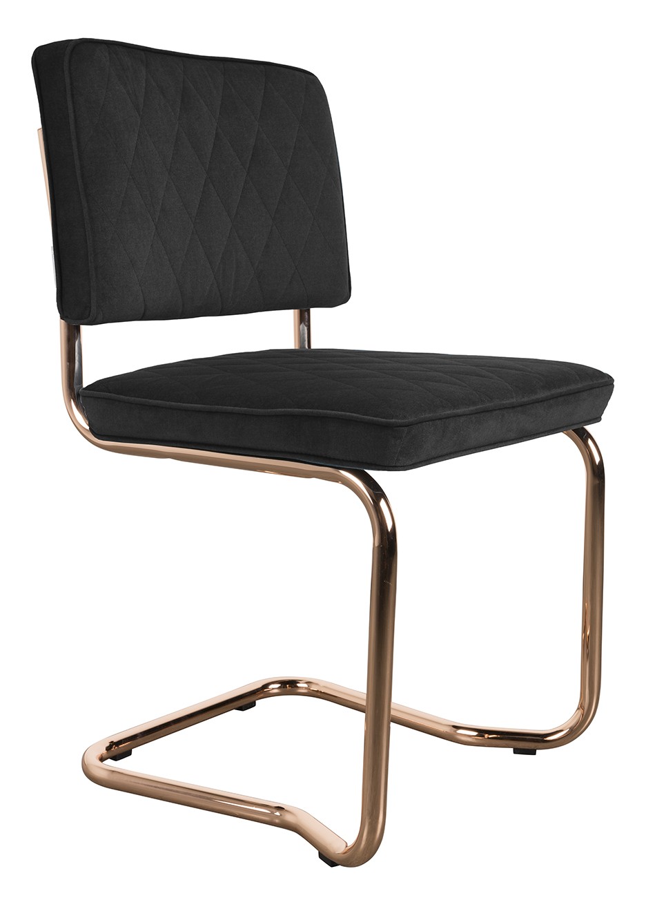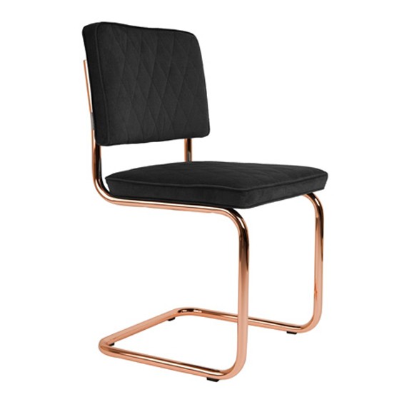 Elegante silla de estructura patín en cobre, tapizada en muy buen tejido, con su agradable balanceo. Version apilable en algunos colores.
