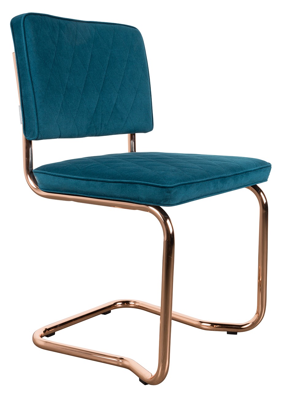Elegante silla de estructura patín en cobre, tapizada en muy buen tejido, con su agradable balanceo. Version apilable en algunos colores.