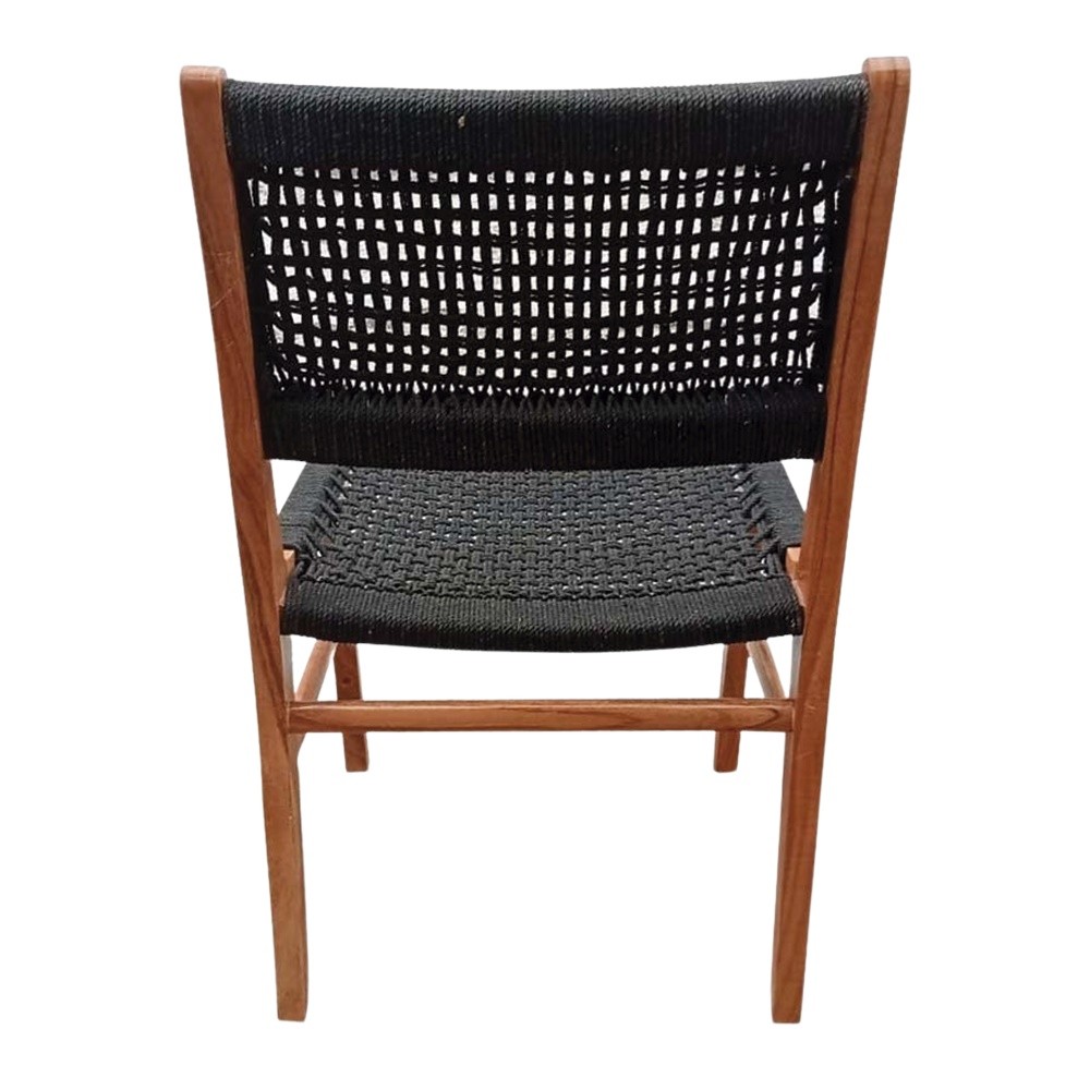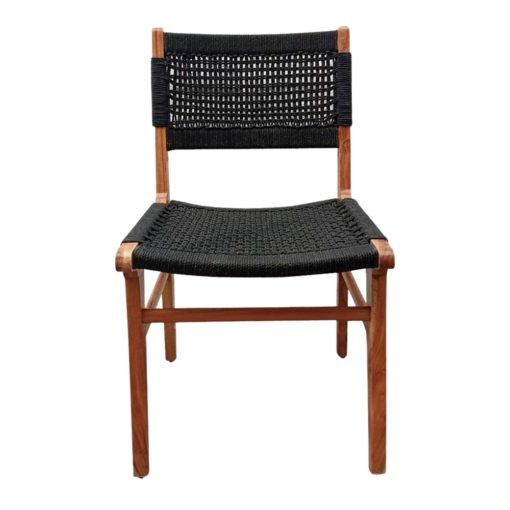 Su estructura está fabricada en madera maciza de acacia, el asiento y respaldo en cuerda trenzada, disponible en 3 colores: marrón, negro o naranja.