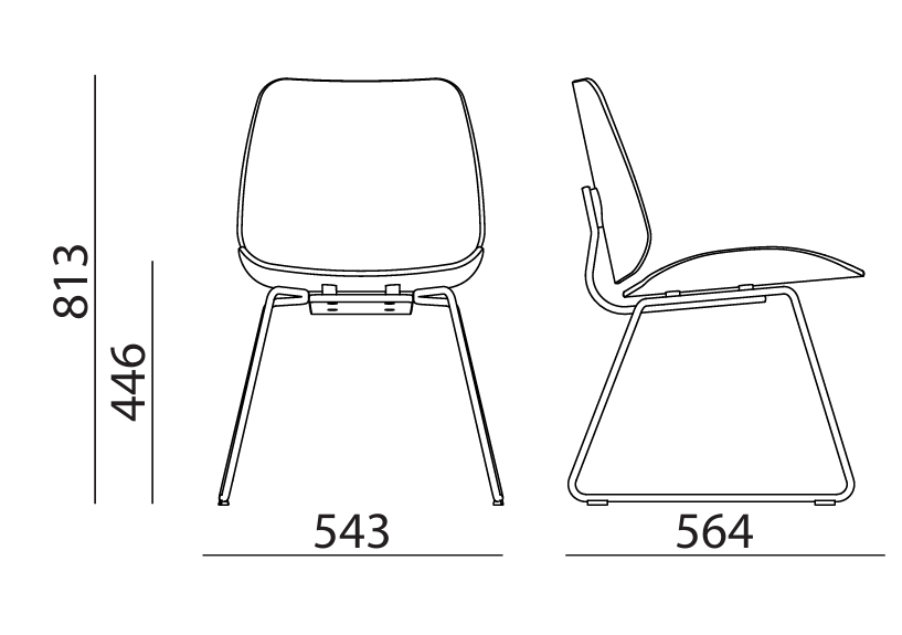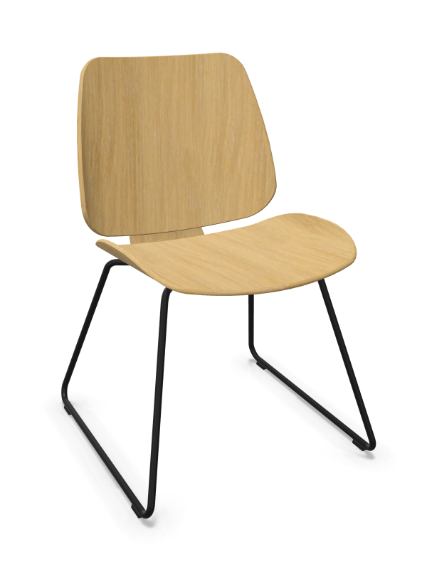 Silla con o sin brazos, estructura de tubo de acero pintado o cromado. Tacos a suelo traslúcidos, con opción de fieltro. Asiento y respaldo en madera contrachapada de roble o nogal, personalizable con tapizado frontal parcial o completo.