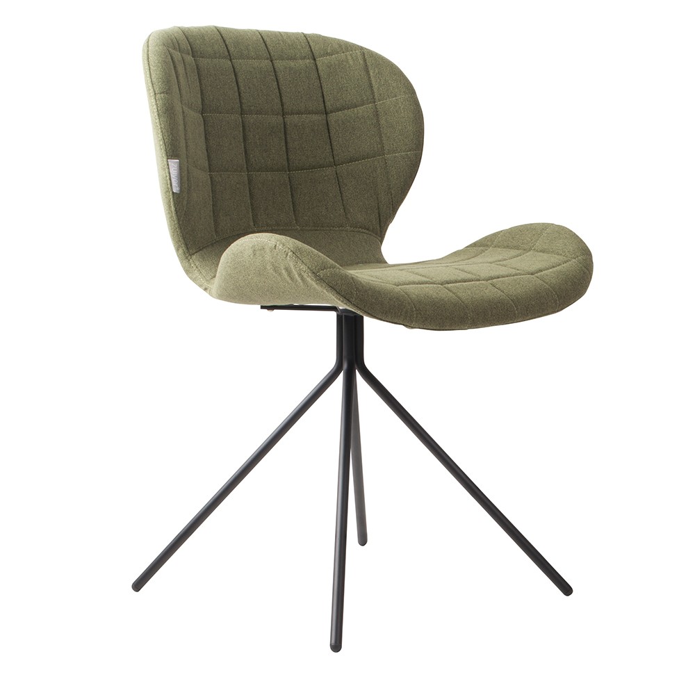 Silla muy confortable. Carcasa en madera contrachapada, acolchada y tapizada en 6 colores diferentes. Pie de acero lacado en negro. Medidas 51x59x79cm. Altura de asiento 47cm, profundidad de asiento 42cm. Gris claro, negro, camel, verde, azul, naranja.