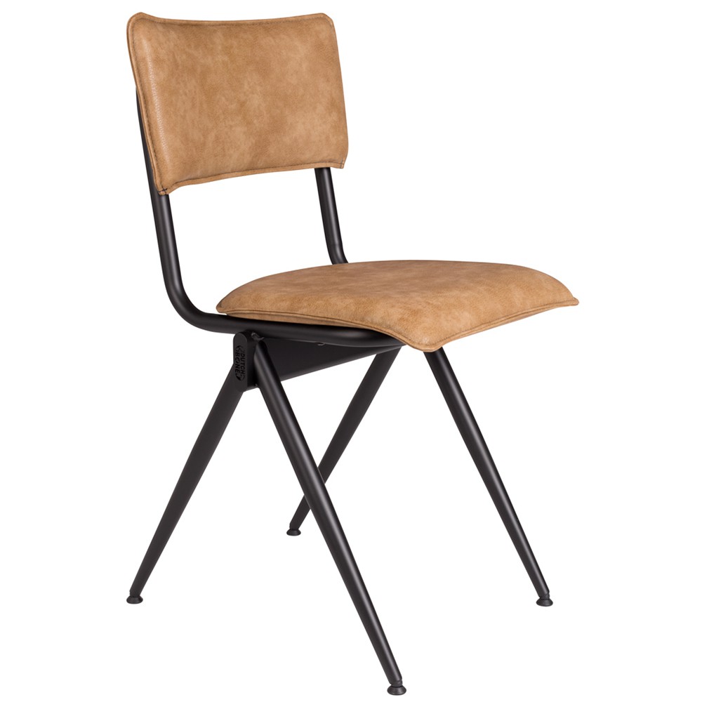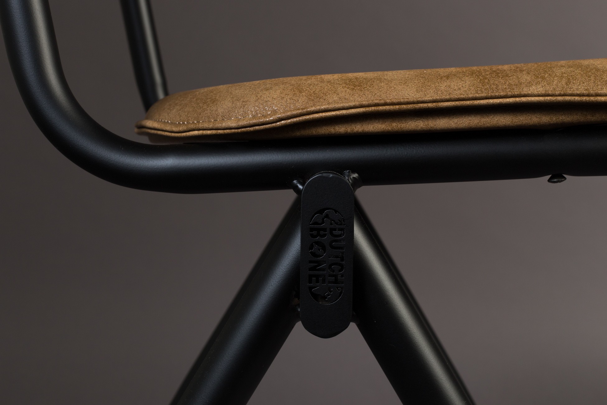 Vintage PU-leather 50.000 Martindale, solidez de color 4. Contrachapado de haya y asiento con espuma de poliuretano, densidad 40. Estructura de acero con recubrimiento en polvo negro con tapas de plástico en los pies. Logotipo de Dutchbone grabado en los laterales. Carga máxima de peso: 110 kg.