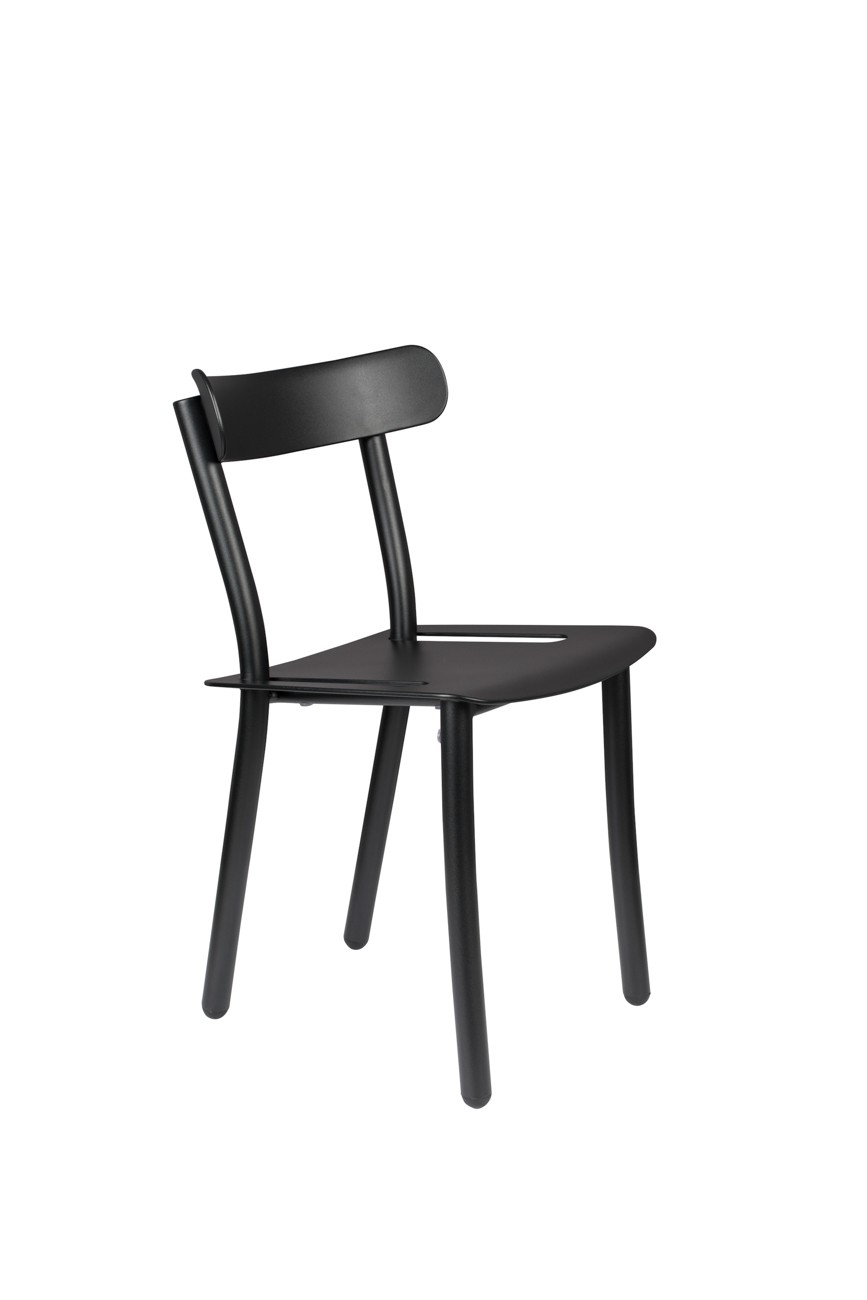 Fabricada íntegramente en aluminio sin mantenimiento. Las patas traseras atravesaran el delgado asiento y permite que se apilen hasta cuatro piezas.