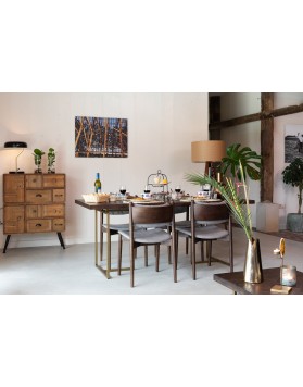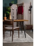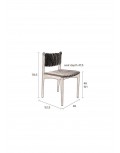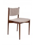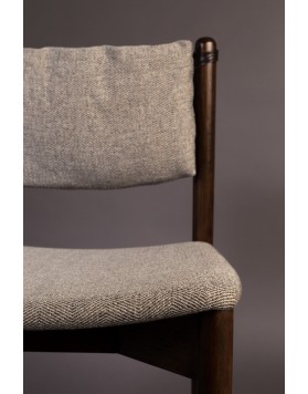 Tejido 100% poliéster con diseño de espiga. Asiento de madera contrachapada con espuma de PU, densidad 30. Cojín del respaldo extraíble con relleno de fibra. Estructura de madera maciza de caucho con respaldo de acacia lacada marrón. Carga máxima de peso: 130 kg. Dimensiones: 46 × 52,5 × 78,5 cm (WxDxH). Altura del asiento: 46 cm Profundidad del asiento: 47,5 cm