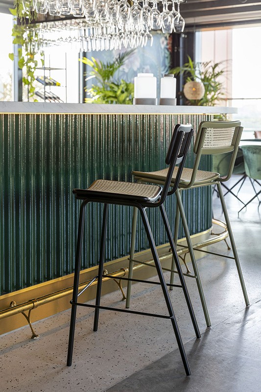 Un taburete de rejilla de hoy en día con una estructura de metal de color. Elegante diseño que no bloquea la luz del día.