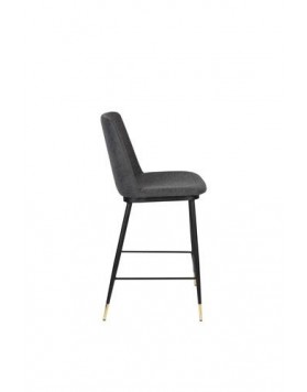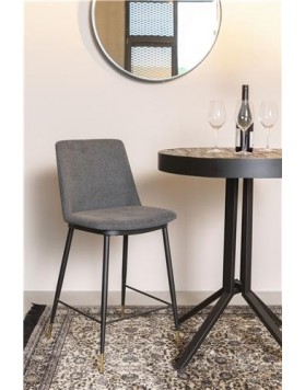 Taburete tapizado en tejido mixto (95% poliéster, 5% nylon) y estructura en acero con recubrimiento de polvo negro con pies chapados en latón cepillado.