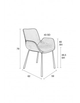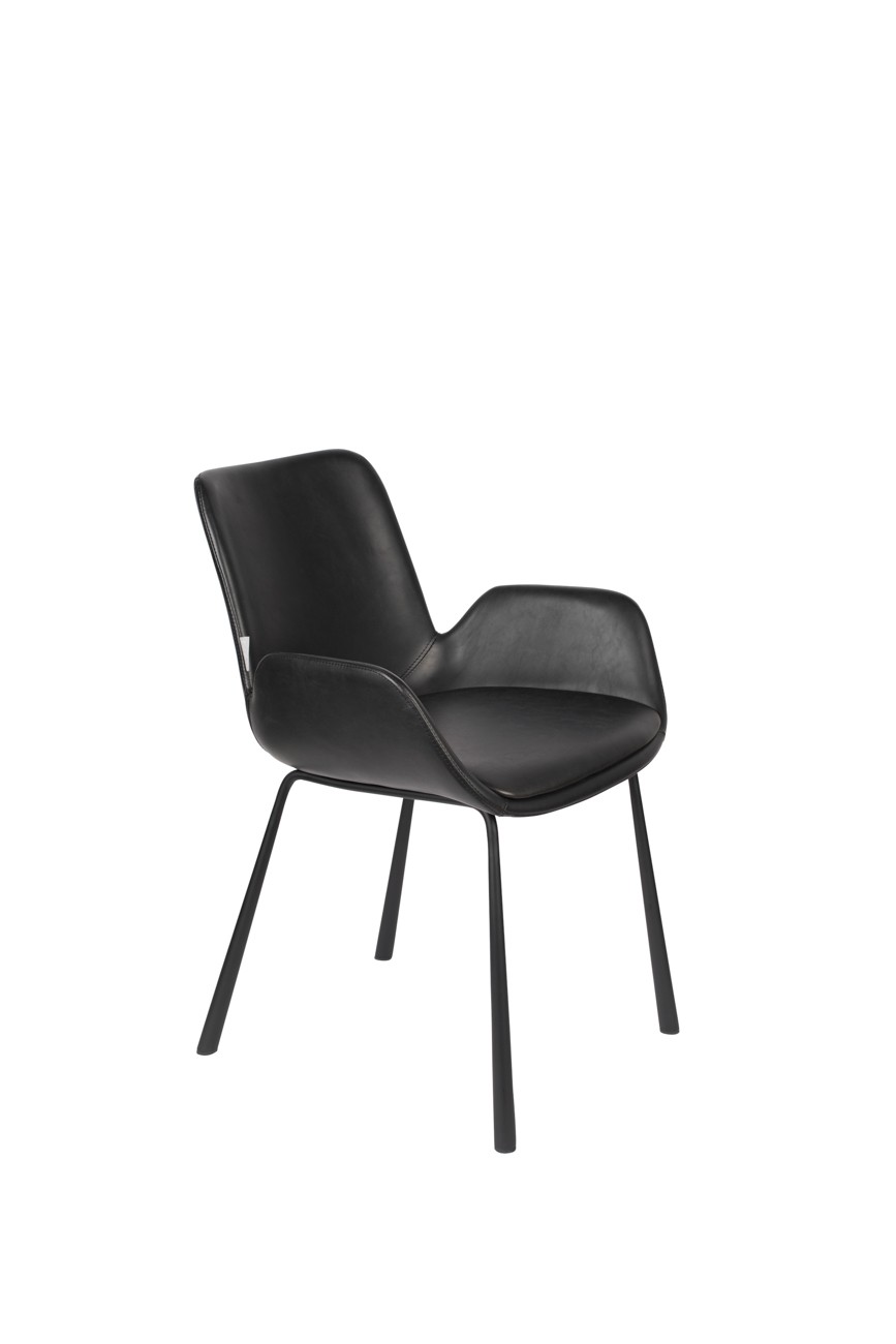 Sillón en ecopiel de PU (50% de PU y 50% de PVC). Relleno de espuma de PU, densidad de espuma: 35-40. Patas de acero con recubrimiento de polvo negro. Carga máxima de peso: 100 kg. Dimensiones: 59x62x79 cm (WxDxH). Altura del asiento: 45,5 cm. Profundidad del asiento: 43 cm. Altura del reposabrazos: 60 cm